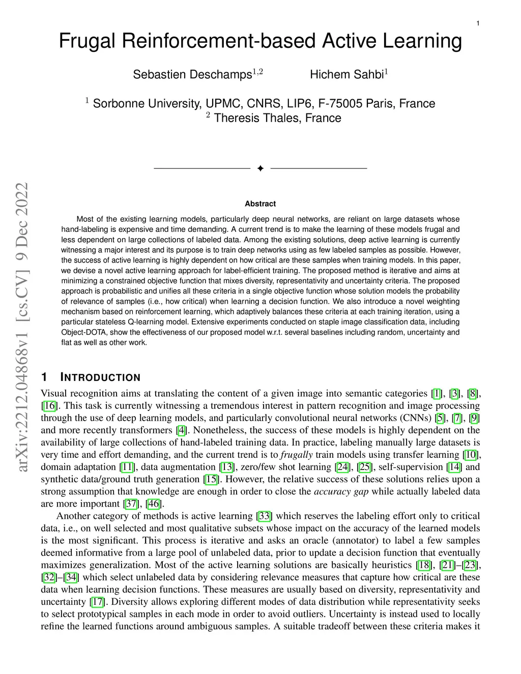 Most of the existing learning models, particularly deep neural networks, are reliant on large datasets whose hand-labeling is expensive and time demanding. A current trend is to make the learning of these models frugal and less dependent on large collections of labeled data. Among the existing solutions, deep active learning is currently witnessing a major interest and its purpose is to train deep networks using as few labeled samples as possible. However, the success of active learning is highly dependent on how critical are these samples when training models. In this paper, we devise a novel active learning approach for label-efficient training. The proposed method is iterative and aims at minimizing a constrained objective function that mixes diversity, representativity and uncertainty criteria. The proposed approach is probabilistic and unifies all these criteria in a single objective function whose solution models the probability of relevance of samples (i.e., how critical) when learning a decision function. We also introduce a novel weighting mechanism based on reinforcement learning, which adaptively balances these criteria at each training iteration, using a particular stateless Q-learning model. Extensive experiments conducted on staple image classification data, including Object-DOTA, show the effectiveness of our proposed model w.r.t. several baselines including random, uncertainty and flat as well as other work.