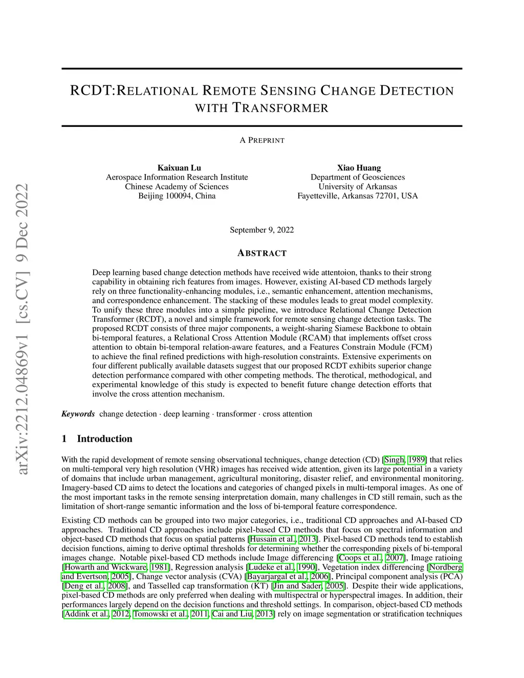 Deep learning based change detection methods have received wide attentoion, thanks to their strong capability in obtaining rich features from images. However, existing AI-based CD methods largely rely on three functionality-enhancing modules, i.e., semantic enhancement, attention mechanisms, and correspondence enhancement. The stacking of these modules leads to great model complexity. To unify these three modules into a simple pipeline, we introduce Relational Change Detection Transformer (RCDT), a novel and simple framework for remote sensing change detection tasks. The proposed RCDT consists of three major components, a weight-sharing Siamese Backbone to obtain bi-temporal features, a Relational Cross Attention Module (RCAM) that implements offset cross attention to obtain bi-temporal relation-aware features, and a Features Constrain Module (FCM) to achieve the final refined predictions with high-resolution constraints. Extensive experiments on four different publically available datasets suggest that our proposed RCDT exhibits superior change detection performance compared with other competing methods. The therotical, methodogical, and experimental knowledge of this study is expected to benefit future change detection efforts that involve the cross attention mechanism.