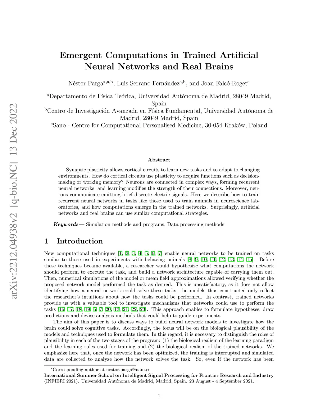 Synaptic plasticity allows cortical circuits to learn new tasks and to adapt to changing environments. How do cortical circuits use plasticity to acquire functions such as decision-making or working memory? Neurons are connected in complex ways, forming recurrent neural networks, and learning modifies the strength of their connections. Moreover, neurons communicate emitting brief discrete electric signals. Here we describe how to train recurrent neural networks in tasks like those used to train animals in neuroscience laboratories, and how computations emerge in the trained networks. Surprisingly, artificial networks and real brains can use similar computational strategies.