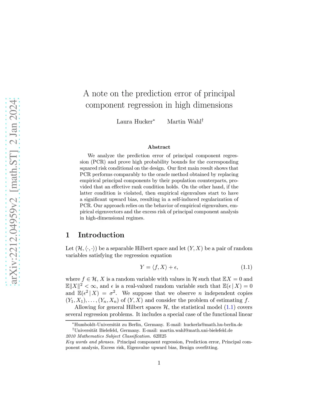 We analyze the prediction error of principal component regression (PCR) and prove high probability bounds for the corresponding squared risk conditional on the design. Our results show that if an effective rank condition holds, then PCR performs comparably to the oracle method obtained by replacing empirical principal components by their population counterparts. On the other hand, if this condition is violated, then empirical eigenvalues start to have a significant upward bias, resulting in a self-induced regularization of PCR. Our approach relies on the behavior of empirical eigenvalues, empirical eigenvectors and the excess risk of principal component analysis in high dimensions.