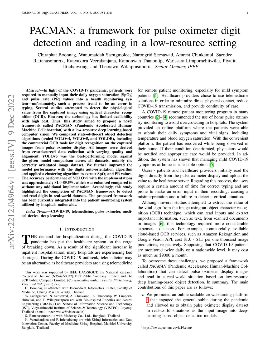 In light of the COVID-19 pandemic, patients were required to manually input their daily oxygen saturation (SpO2) and pulse rate (PR) values into a health monitoring system-unfortunately, such a process trend to be an error in typing. Several studies attempted to detect the physiological value from the captured image using optical character recognition (OCR). However, the technology has limited availability with high cost. Thus, this study aimed to propose a novel framework called PACMAN (Pandemic Accelerated Human-Machine Collaboration) with a low-resource deep learning-based computer vision. We compared state-of-the-art object detection algorithms (scaled YOLOv4, YOLOv5, and YOLOR), including the commercial OCR tools for digit recognition on the captured images from pulse oximeter display. All images were derived from crowdsourced data collection with varying quality and alignment. YOLOv5 was the best-performing model against the given model comparison across all datasets, notably the correctly orientated image dataset. We further improved the model performance with the digits auto-orientation algorithm and applied a clustering algorithm to extract SpO2 and PR values. The accuracy performance of YOLOv5 with the implementations was approximately 81.0-89.5%, which was enhanced compared to without any additional implementation. Accordingly, this study highlighted the completion of PACMAN framework to detect and read digits in real-world datasets. The proposed framework has been currently integrated into the patient monitoring system utilized by hospitals nationwide.