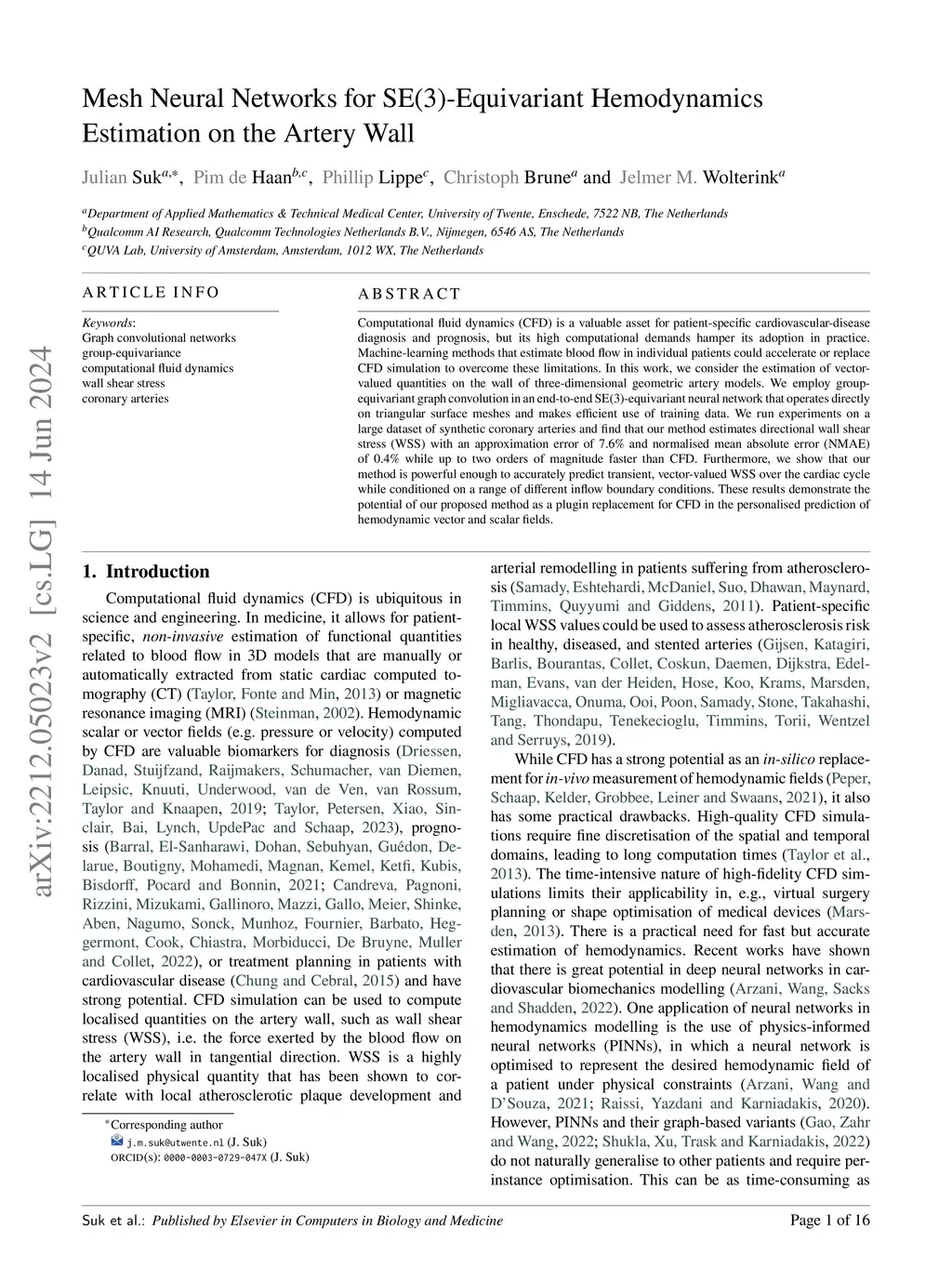 Computational fluid dynamics (CFD) is a valuable asset for patient-specific cardiovascular-disease diagnosis and prognosis, but its high computational demands hamper its adoption in practice. Machine-learning methods that estimate blood flow in individual patients could accelerate or replace CFD simulation to overcome these limitations. In this work, we consider the estimation of vector-valued quantities on the wall of three-dimensional geometric artery models. We employ group equivariant graph convolution in an end-to-end SE(3)-equivariant neural network that operates directly on triangular surface meshes and makes efficient use of training data. We run experiments on a large dataset of synthetic coronary arteries and find that our method estimates directional wall shear stress (WSS) with an approximation error of 7.6% and normalised mean absolute error (NMAE) of 0.4% while up to two orders of magnitude faster than CFD. Furthermore, we show that our method is powerful enough to accurately predict transient, vector-valued WSS over the cardiac cycle while conditioned on a range of different inflow boundary conditions. These results demonstrate the potential of our proposed method as a plugin replacement for CFD in the personalised prediction of hemodynamic vector and scalar fields.