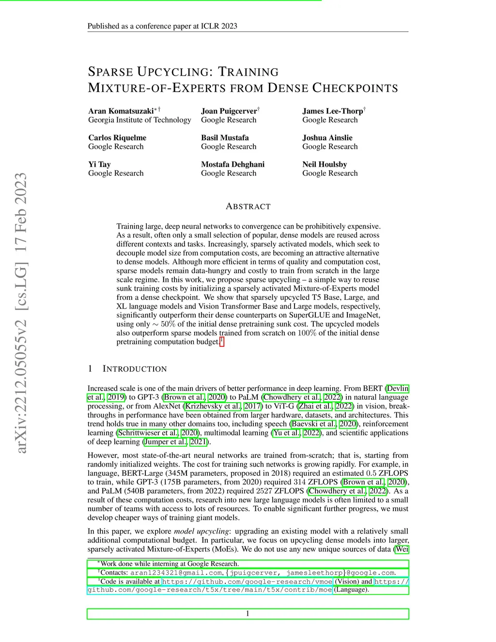 Sparse Upcycling: Training Mixture-of-Experts from Dense Checkpoints