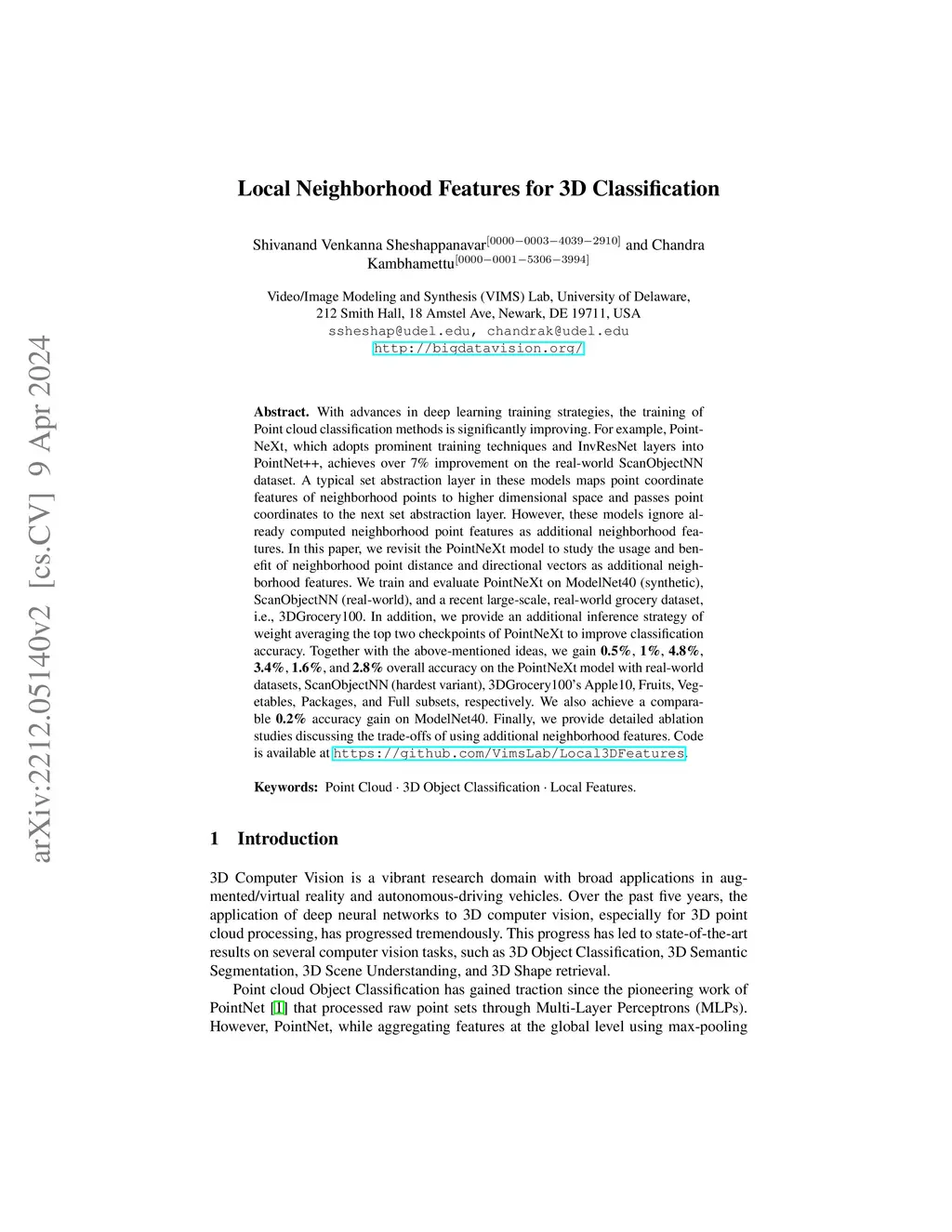 With advances in deep learning model training strategies, the training of Point cloud classification methods is significantly improving. For example, PointNeXt, which adopts prominent training techniques and InvResNet layers into PointNet++, achieves over 7% improvement on the real-world ScanObjectNN dataset. However, most of these models use point coordinates features of neighborhood points mapped to higher dimensional space while ignoring the neighborhood point features computed before feeding to the network layers. In this paper, we revisit the PointNeXt model to study the usage and benefit of such neighborhood point features. We train and evaluate PointNeXt on ModelNet40 (synthetic), ScanObjectNN (real-world), and a recent large-scale, real-world grocery dataset, i.e., 3DGrocery100. In addition, we provide an additional inference strategy of weight averaging the top two checkpoints of PointNeXt to improve classification accuracy. Together with the abovementioned ideas, we gain 0.5%, 1%, 4.8%, 3.4%, and 1.6% overall accuracy on the PointNeXt model with real-world datasets, ScanObjectNN (hardest variant), 3DGrocery100's Apple10, Fruits, Vegetables, and Packages subsets, respectively. We also achieve a comparable 0.2% accuracy gain on ModelNet40.