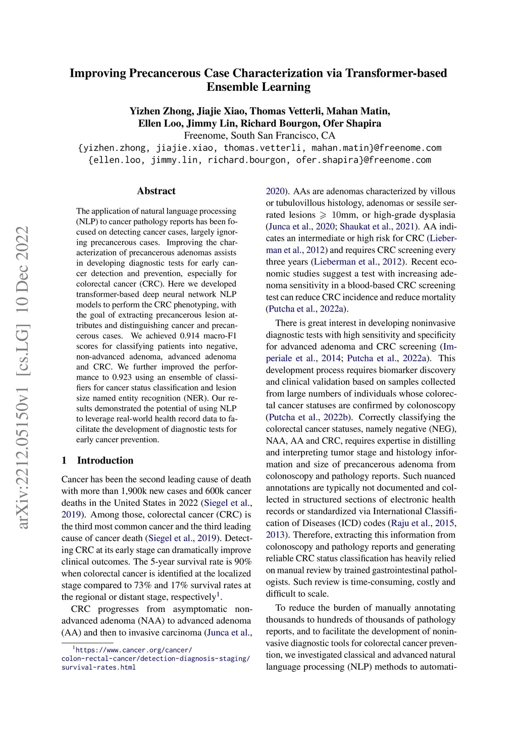 The application of natural language processing (NLP) to cancer pathology reports has been focused on detecting cancer cases, largely ignoring precancerous cases. Improving the characterization of precancerous adenomas assists in developing diagnostic tests for early cancer detection and prevention, especially for colorectal cancer (CRC). Here we developed transformer-based deep neural network NLP models to perform the CRC phenotyping, with the goal of extracting precancerous lesion attributes and distinguishing cancer and precancerous cases. We achieved 0.914 macro-F1 scores for classifying patients into negative, non-advanced adenoma, advanced adenoma and CRC. We further improved the performance to 0.923 using an ensemble of classifiers for cancer status classification and lesion size named entity recognition (NER). Our results demonstrated the potential of using NLP to leverage real-world health record data to facilitate the development of diagnostic tests for early cancer prevention.