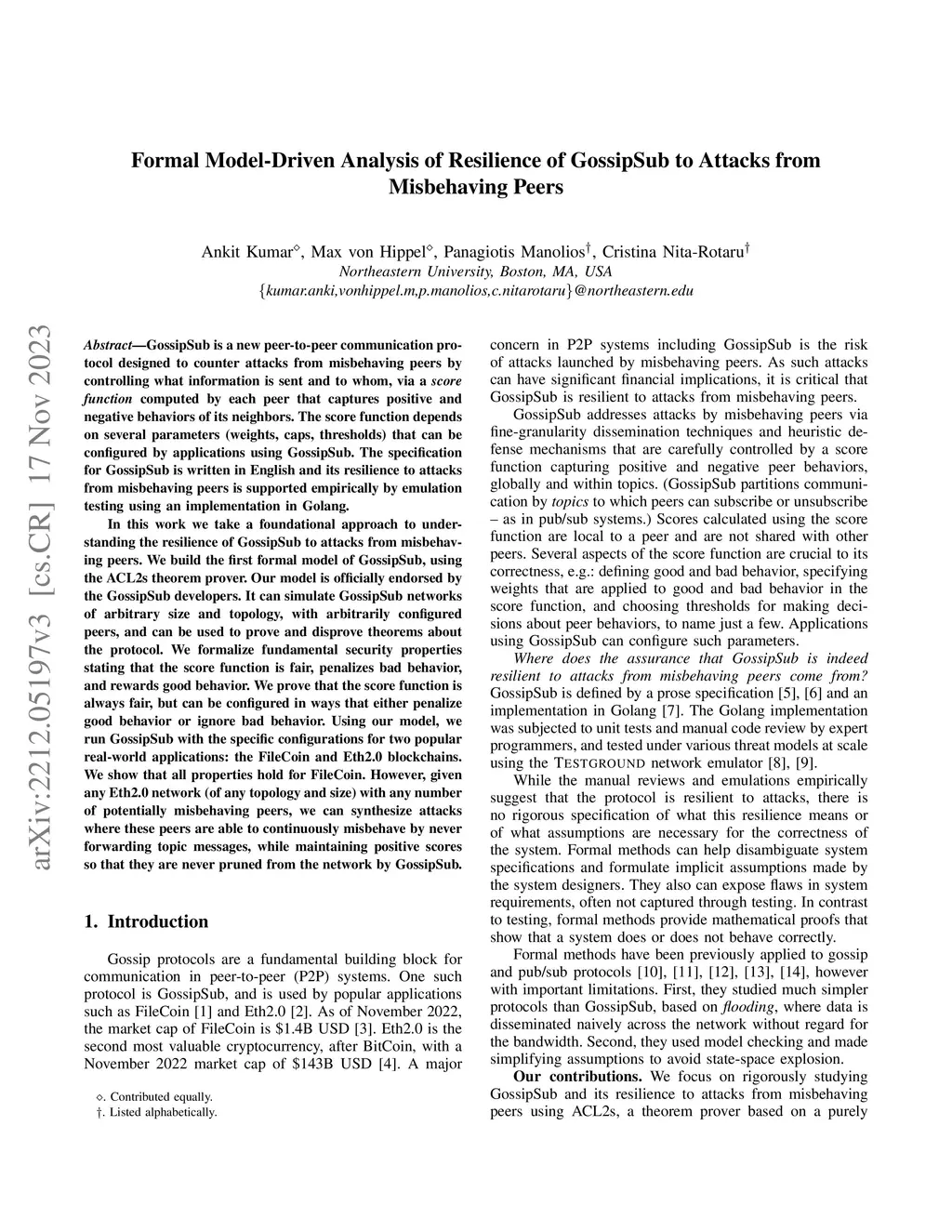GossipSub is a new peer-to-peer communication protocol designed to counter attacks from misbehaving peers by controlling what information is sent and to whom, via a score function computed by each peer that captures positive and negative behaviors of its neighbors. The score function depends on several parameters (weights, caps, thresholds) that can be configured by applications using GossipSub. The specification for GossipSub is written in English and its resilience to attacks from misbehaving peers is supported empirically by emulation testing using an implementation in Golang. In this work we take a foundational approach to understanding the resilience of GossipSub to attacks from misbehaving peers. We build the first formal model of GossipSub, using the ACL2s theorem prover. Our model is officially endorsed by the GossipSub developers. It can simulate GossipSub networks of arbitrary size and topology, with arbitrarily configured peers, and can be used to prove and disprove theorems about the protocol. We formalize fundamental security properties stating that the score function is fair, penalizes bad behavior, and rewards good behavior. We prove that the score function is always fair, but can be configured in ways that either penalize good behavior or ignore bad behavior. Using our model, we run GossipSub with the specific configurations for two popular real-world applications: the FileCoin and Eth2.0 blockchains. We show that all properties hold for FileCoin. However, given any Eth2.0 network (of any topology and size) with any number of potentially misbehaving peers, we can synthesize attacks where these peers are able to continuously misbehave by never forwarding topic messages, while maintaining positive scores so that they are never pruned from the network by GossipSub.