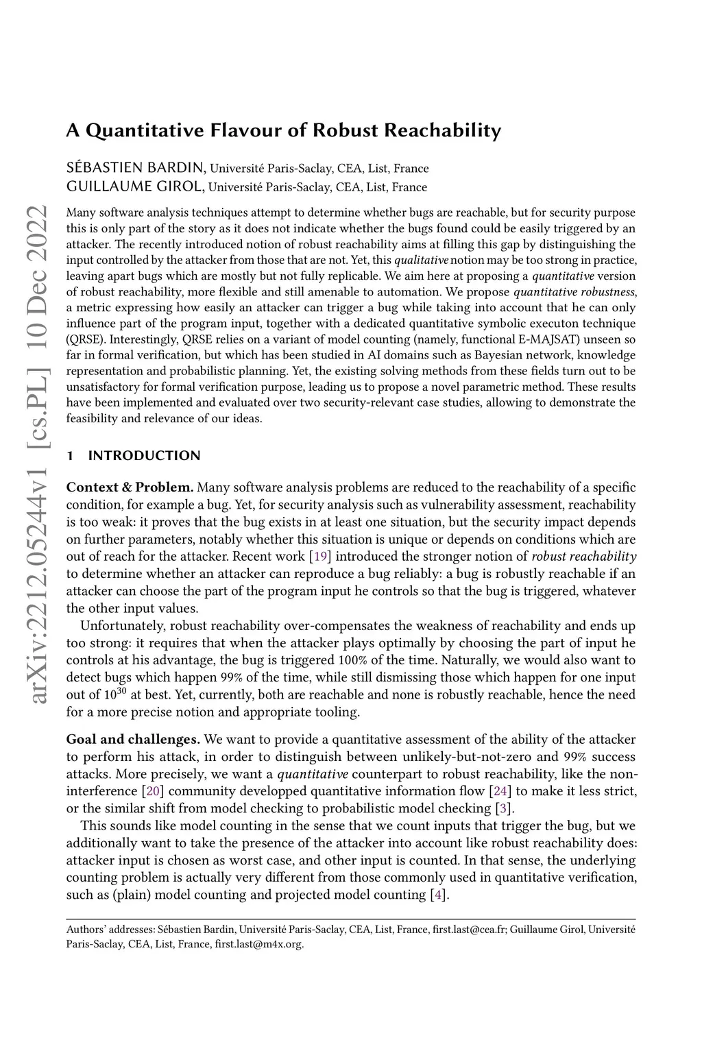 Many software analysis techniques attempt to determine whether bugs are reachable, but for security purpose this is only part of the story as it does not indicate whether the bugs found could be easily triggered by an attacker. The recently introduced notion of robust reachability aims at filling this gap by distinguishing the input controlled by the attacker from those that are not. Yet, this qualitative notion may be too strong in practice, leaving apart bugs which are mostly but not fully replicable. We aim here at proposing a quantitative version of robust reachability, more flexible and still amenable to automation. We propose quantitative robustness, a metric expressing how easily an attacker can trigger a bug while taking into account that he can only influence part of the program input, together with a dedicated quantitative symbolic execution technique (QRSE). Interestingly, QRSE relies on a variant of model counting (namely, functional E-MAJSAT) unseen so far in formal verification, but which has been studied in AI domains such as Bayesian network, knowledge representation and probabilistic planning. Yet, the existing solving methods from these fields turn out to be unsatisfactory for formal verification purpose, leading us to propose a novel parametric method. These results have been implemented and evaluated over two security-relevant case studies, allowing to demonstrate the feasibility and relevance of our ideas.