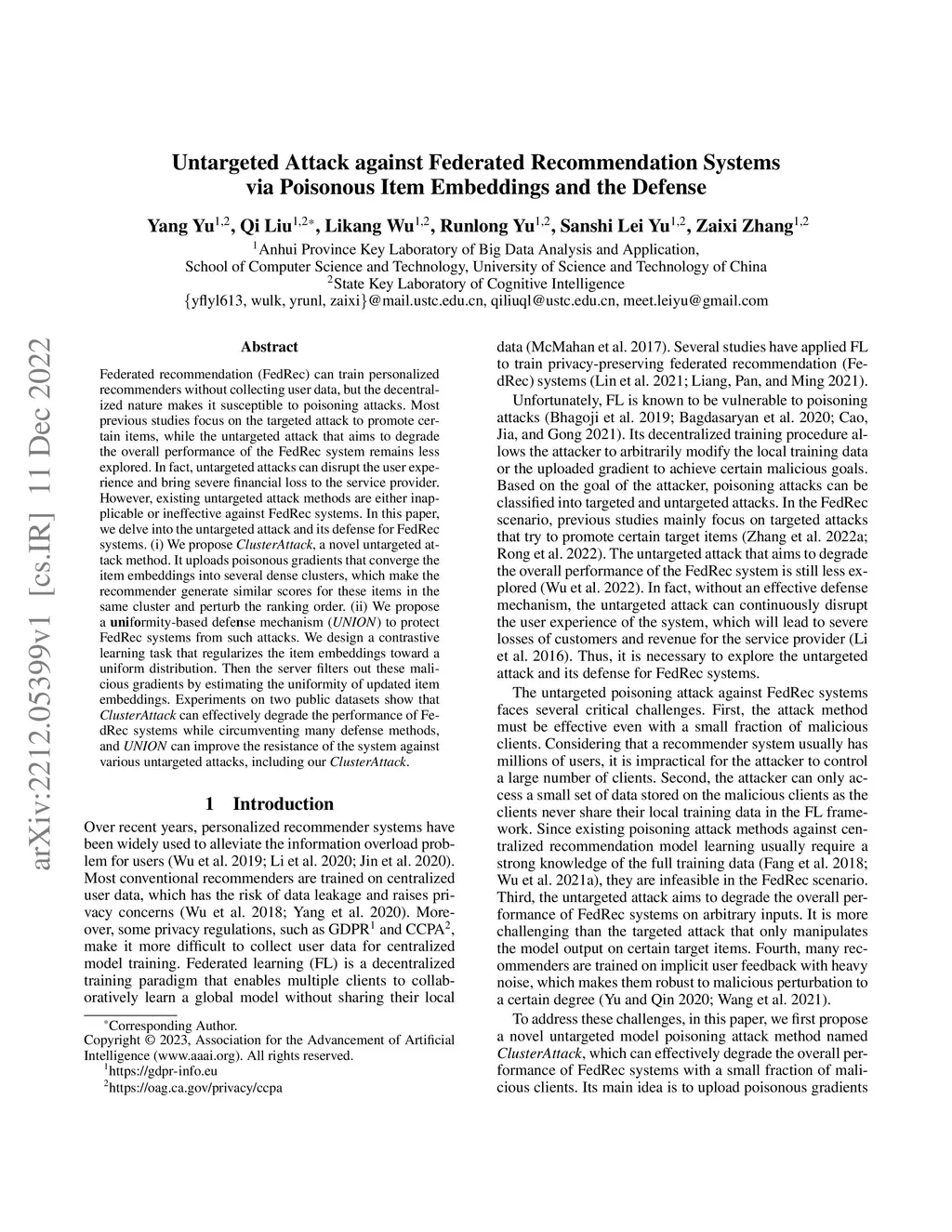 Federated recommendation (FedRec) can train personalized recommenders without collecting user data, but the decentralized nature makes it susceptible to poisoning attacks. Most previous studies focus on the targeted attack to promote certain items, while the untargeted attack that aims to degrade the overall performance of the FedRec system remains less explored. In fact, untargeted attacks can disrupt the user experience and bring severe financial loss to the service provider. However, existing untargeted attack methods are either inapplicable or ineffective against FedRec systems. In this paper, we delve into the untargeted attack and its defense for FedRec systems. (i) We propose ClusterAttack, a novel untargeted attack method. It uploads poisonous gradients that converge the item embeddings into several dense clusters, which make the recommender generate similar scores for these items in the same cluster and perturb the ranking order. (ii) We propose a uniformity-based defense mechanism (UNION) to protect FedRec systems from such attacks. We design a contrastive learning task that regularizes the item embeddings toward a uniform distribution. Then the server filters out these malicious gradients by estimating the uniformity of updated item embeddings. Experiments on two public datasets show that ClusterAttack can effectively degrade the performance of FedRec systems while circumventing many defense methods, and UNION can improve the resistance of the system against various untargeted attacks, including our ClusterAttack.
