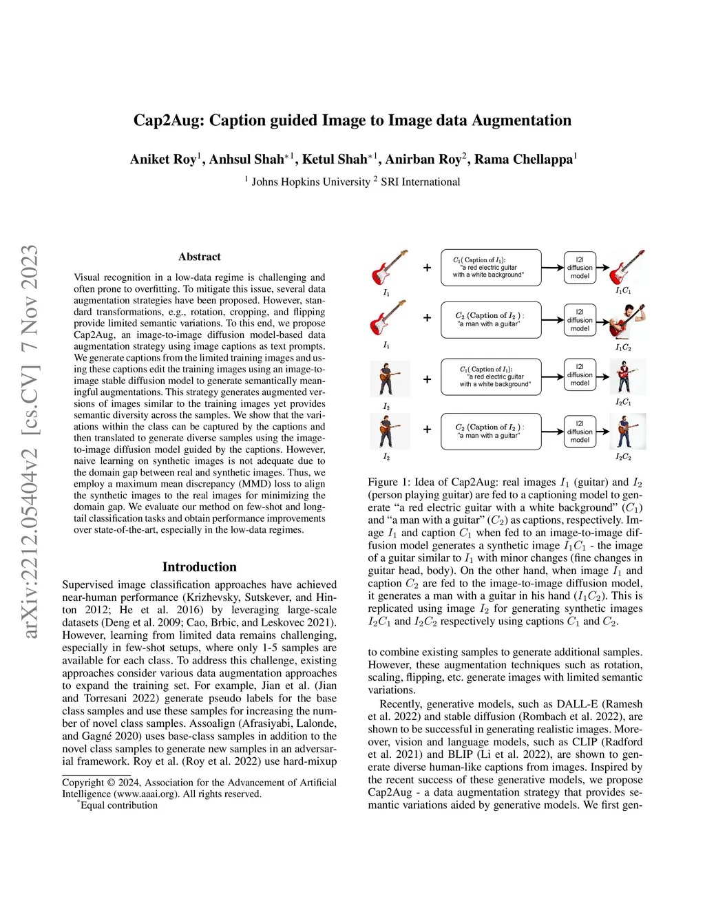 Visual recognition in a low-data regime is challenging and often prone to overfitting. To mitigate this issue, several data augmentation strategies have been proposed. However, standard transformations, e.g., rotation, cropping, and flipping provide limited semantic variations. To this end, we propose Cap2Aug, an image-to-image diffusion model-based data augmentation strategy using image captions as text prompts. We generate captions from the limited training images and using these captions edit the training images using an image-to-image stable diffusion model to generate semantically meaningful augmentations. This strategy generates augmented versions of images similar to the training images yet provides semantic diversity across the samples. We show that the variations within the class can be captured by the captions and then translated to generate diverse samples using the image-to-image diffusion model guided by the captions. However, naive learning on synthetic images is not adequate due to the domain gap between real and synthetic images. Thus, we employ a maximum mean discrepancy (MMD) loss to align the synthetic images to the real images for minimizing the domain gap. We evaluate our method on few-shot and long-tail classification tasks and obtain performance improvements over state-of-the-art, especially in the low-data regimes.