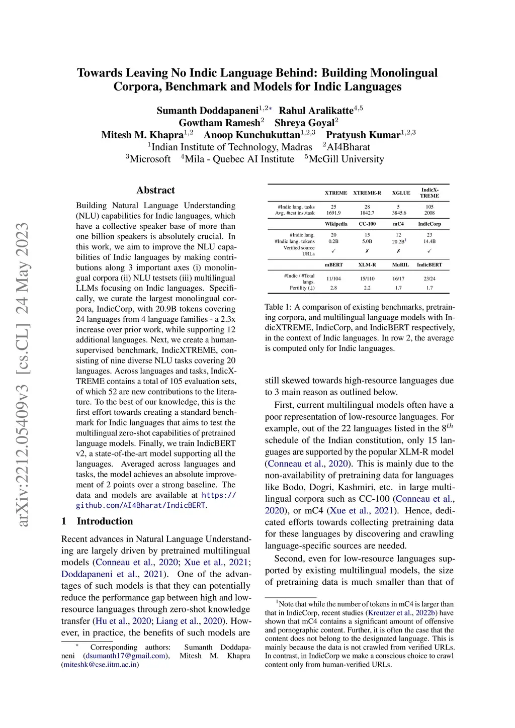 In this work, we introduce IndicXTREME, a benchmark consisting of nine diverse tasks covering 18 languages from the Indic sub-continent belonging to four different families. Across languages and tasks, IndicXTREME contains a total of 103 evaluation sets, of which 51 are new contributions to the literature. To maintain high quality, we only use human annotators to curate or translate\footnote{for IndicXParaphrase, where an automatic translation system is used, a second human verification and correction step is done.} our datasets. To the best of our knowledge, this is the first effort toward creating a standard benchmark for Indic languages that aims to test the zero-shot capabilities of pretrained language models. We also release IndicCorp v2, an updated and much larger version of IndicCorp that contains 20.9 billion tokens in 24 languages. We pretrain IndicBERT v2 on IndicCorp v2 and evaluate it on IndicXTREME to show that it outperforms existing multilingual language models such as XLM-R and MuRIL.