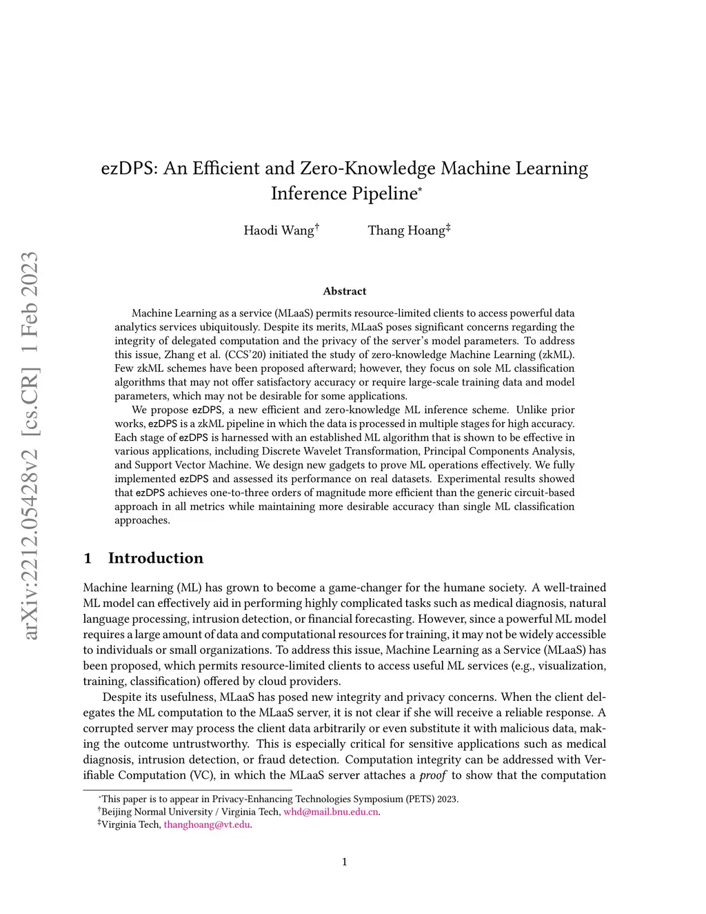 Machine Learning as a service (MLaaS) permits resource-limited clients to access powerful data analytics services ubiquitously. Despite its merits, MLaaS poses significant concerns regarding the integrity of delegated computation and the privacy of the server's model parameters. To address this issue, Zhang et al. (CCS'20) initiated the study of zero-knowledge Machine Learning (zkML). Few zkML schemes have been proposed afterward; however, they focus on sole ML classification algorithms that may not offer satisfactory accuracy or require large-scale training data and model parameters, which may not be desirable for some applications. We propose ezDPS, a new efficient and zero-knowledge ML inference scheme. Unlike prior works, ezDPS is a zkML pipeline in which the data is processed in multiple stages for high accuracy. Each stage of ezDPS is harnessed with an established ML algorithm that is shown to be effective in various applications, including Discrete Wavelet Transformation, Principal Components Analysis, and Support Vector Machine. We design new gadgets to prove ML operations effectively. We fully implemented ezDPS and assessed its performance on real datasets. Experimental results showed that ezDPS achieves one-to-three orders of magnitude more efficient than the generic circuit-based approach in all metrics while maintaining more desirable accuracy than single ML classification approaches.