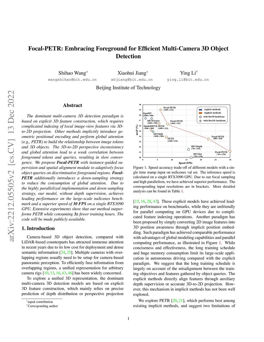 The dominant multi-camera 3D detection paradigm is based on explicit 3D feature construction, which requires complicated indexing of local image-view features via 3D-to-2D projection. Other methods implicitly introduce geometric positional encoding and perform global attention (e.g., PETR) to build the relationship between image tokens and 3D objects. The 3D-to-2D perspective inconsistency and global attention lead to a weak correlation between foreground tokens and queries, resulting in slow convergence. We propose Focal-PETR with instance-guided supervision and spatial alignment module to adaptively focus object queries on discriminative foreground regions. Focal-PETR additionally introduces a down-sampling strategy to reduce the consumption of global attention. Due to the highly parallelized implementation and down-sampling strategy, our model, without depth supervision, achieves leading performance on the large-scale nuScenes benchmark and a superior speed of 30 FPS on a single RTX3090 GPU. Extensive experiments show that our method outperforms PETR while consuming 3x fewer training hours. The code will be made publicly available.