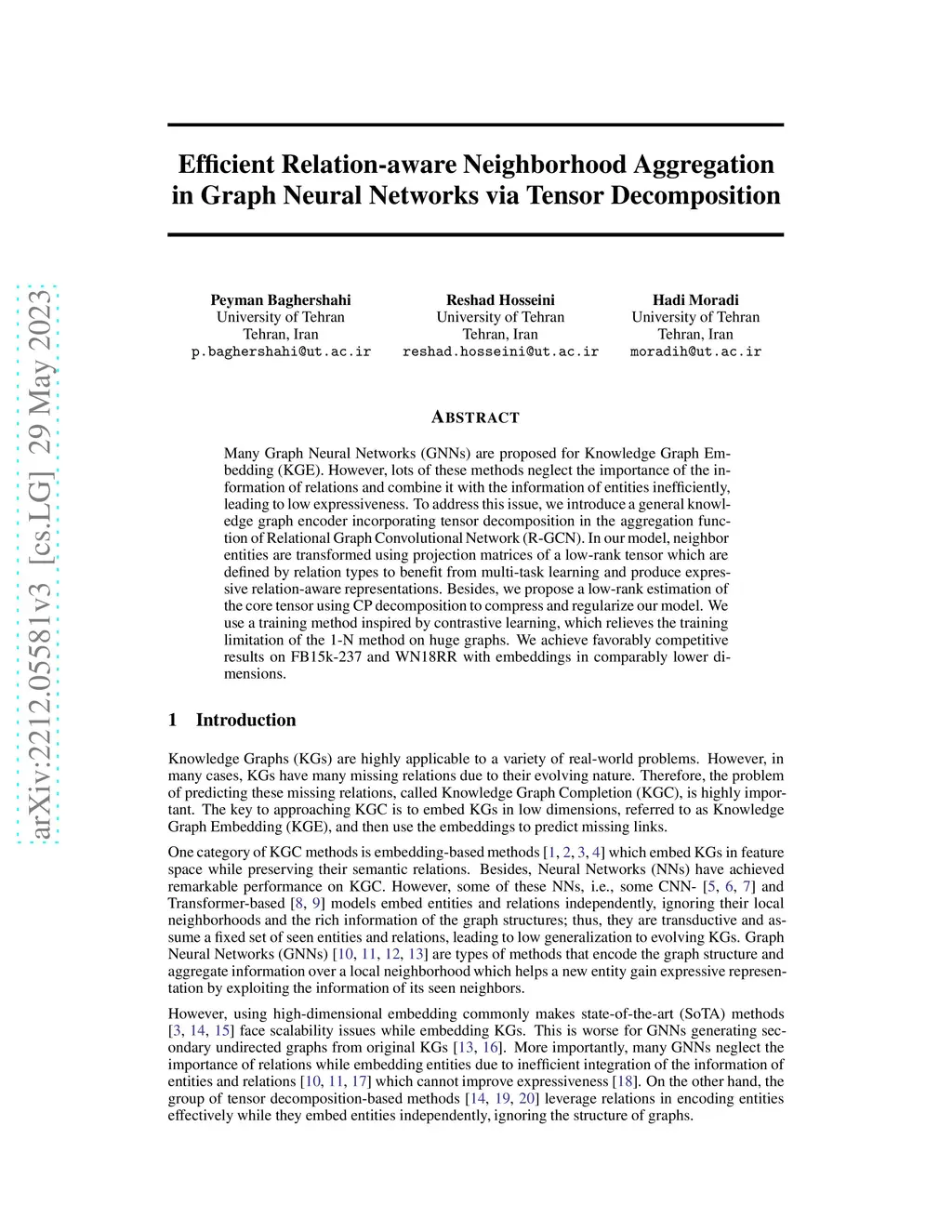 Many Graph Neural Networks (GNNs) are proposed for Knowledge Graph Embedding (KGE). However, lots of these methods neglect the importance of the information of relations and combine it with the information of entities inefficiently, leading to low expressiveness. To address this issue, we introduce a general knowledge graph encoder incorporating tensor decomposition in the aggregation function of Relational Graph Convolutional Network (R-GCN). In our model, neighbor entities are transformed using projection matrices of a low-rank tensor which are defined by relation types to benefit from multi-task learning and produce expressive relation-aware representations. Besides, we propose a low-rank estimation of the core tensor using CP decomposition to compress and regularize our model. We use a training method inspired by contrastive learning, which relieves the training limitation of the 1-N method on huge graphs. We achieve favorably competitive results on FB15k-237 and WN18RR with embeddings in comparably lower dimensions.