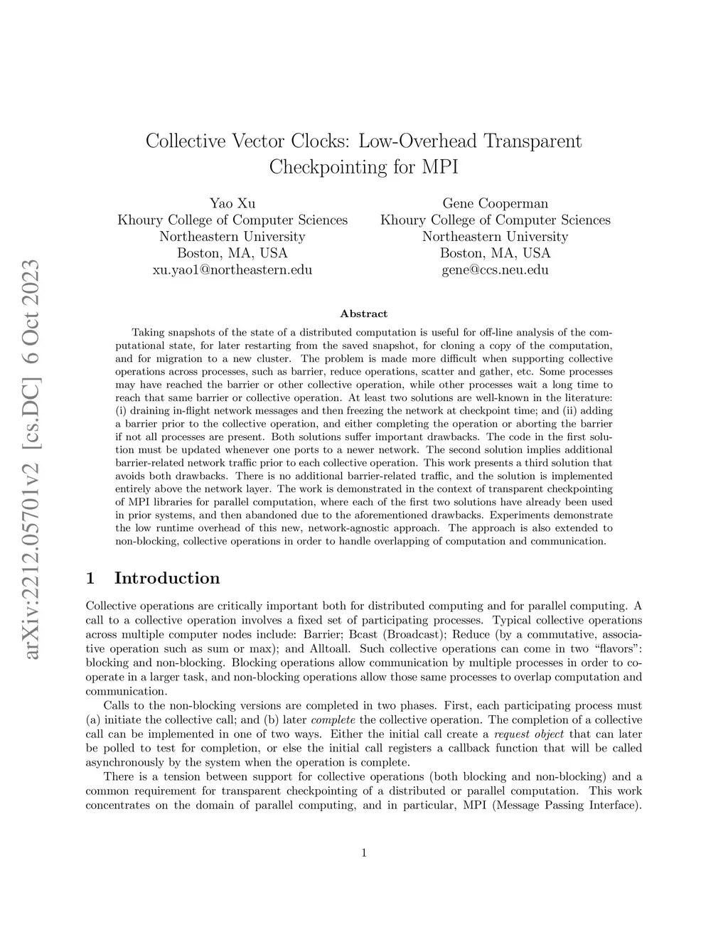 Taking snapshots of the state of a distributed computation is useful for off-line analysis of the computational state, for later restarting from the saved snapshot, for cloning a copy of the computation, and for migration to a new cluster. The problem is made more difficult when supporting collective operations across processes, such as barrier, reduce operations, scatter and gather, etc. Some processes may have reached the barrier or other collective operation, while other processes wait a long time to reach that same barrier or collective operation. At least two solutions are well-known in the literature: (I) draining in-flight network messages and then freezing the network at checkpoint time; and (ii) adding a barrier prior to the collective operation, and either completing the operation or aborting the barrier if not all processes are present. Both solutions suffer important drawbacks. The code in the first solution must be updated whenever one ports to a newer network. The second solution implies additional barrier-related network traffic prior to each collective operation. This work presents a third solution that avoids both drawbacks. There is no additional barrier-related traffic, and the solution is implemented entirely above the network layer. The work is demonstrated in the context of transparent checkpointing of MPI libraries for parallel computation, where each of the first two solutions have already been used in prior systems, and then abandoned due to the aforementioned drawbacks. Experiments demonstrate the low runtime overhead of this new, network-agnostic approach. The approach is also extended to non-blocking, collective operations in order to handle overlapping of computation and communication.