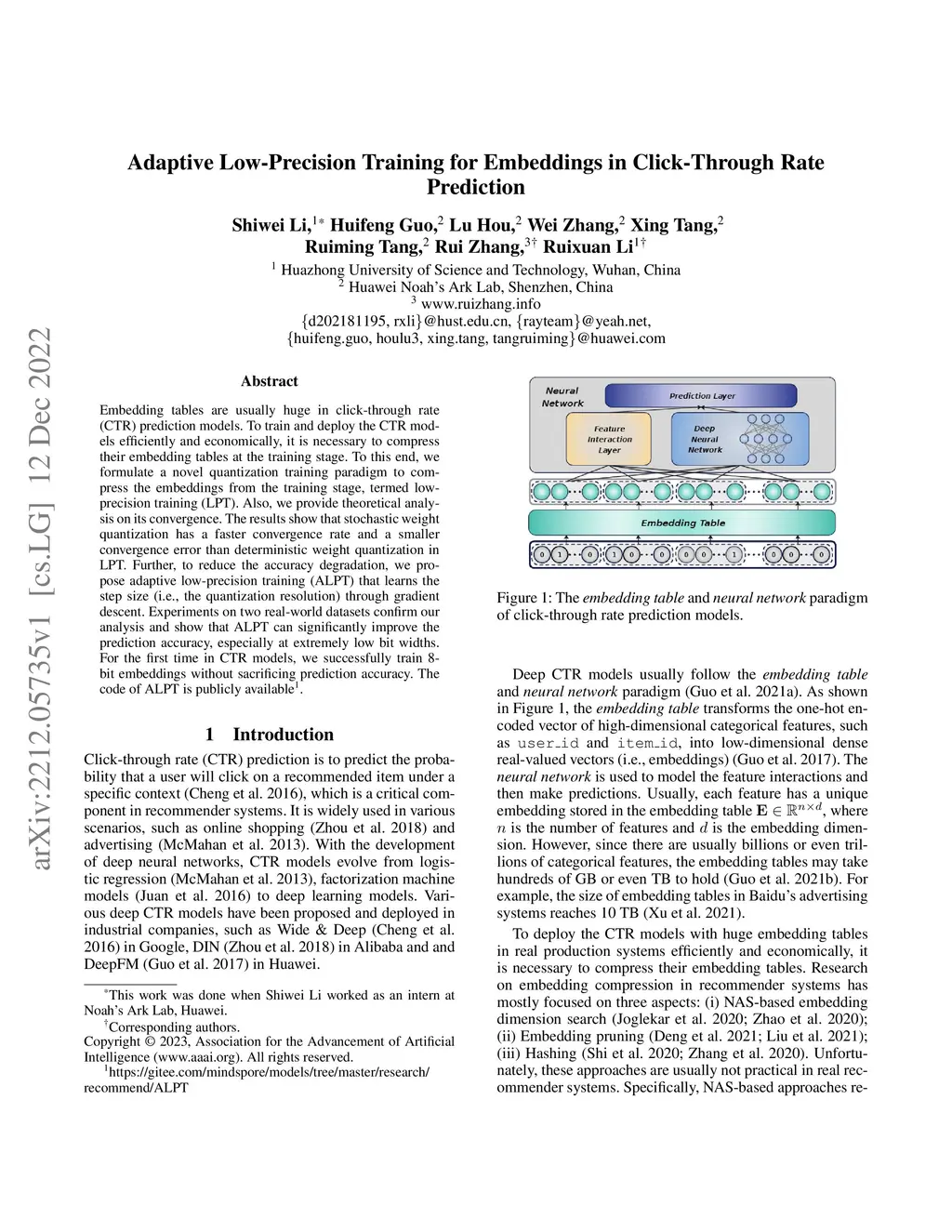 Embedding tables are usually huge in click-through rate (CTR) prediction models. To train and deploy the CTR models efficiently and economically, it is necessary to compress their embedding tables at the training stage. To this end, we formulate a novel quantization training paradigm to compress the embeddings from the training stage, termed low-precision training (LPT). Also, we provide theoretical analysis on its convergence. The results show that stochastic weight quantization has a faster convergence rate and a smaller convergence error than deterministic weight quantization in LPT. Further, to reduce the accuracy degradation, we propose adaptive low-precision training (ALPT) that learns the step size (i.e., the quantization resolution) through gradient descent. Experiments on two real-world datasets confirm our analysis and show that ALPT can significantly improve the prediction accuracy, especially at extremely low bit widths. For the first time in CTR models, we successfully train 8-bit embeddings without sacrificing prediction accuracy. The code of ALPT is publicly available.