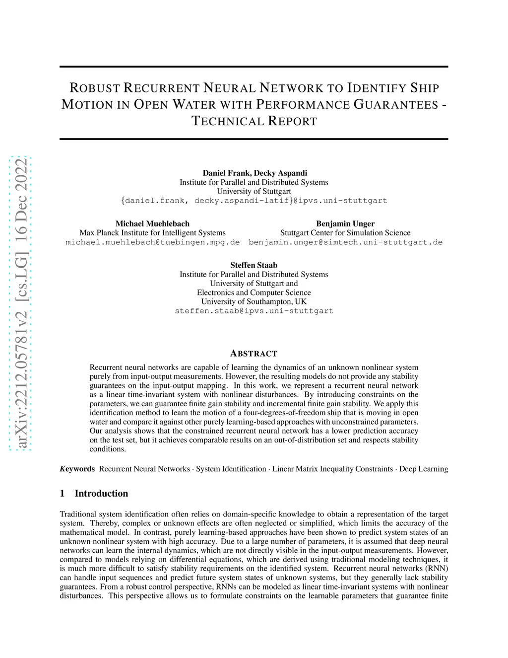 Robust Recurrent Neural Network to Identify Ship Motion in Open Water with Performance Guarantees -- Technical Report