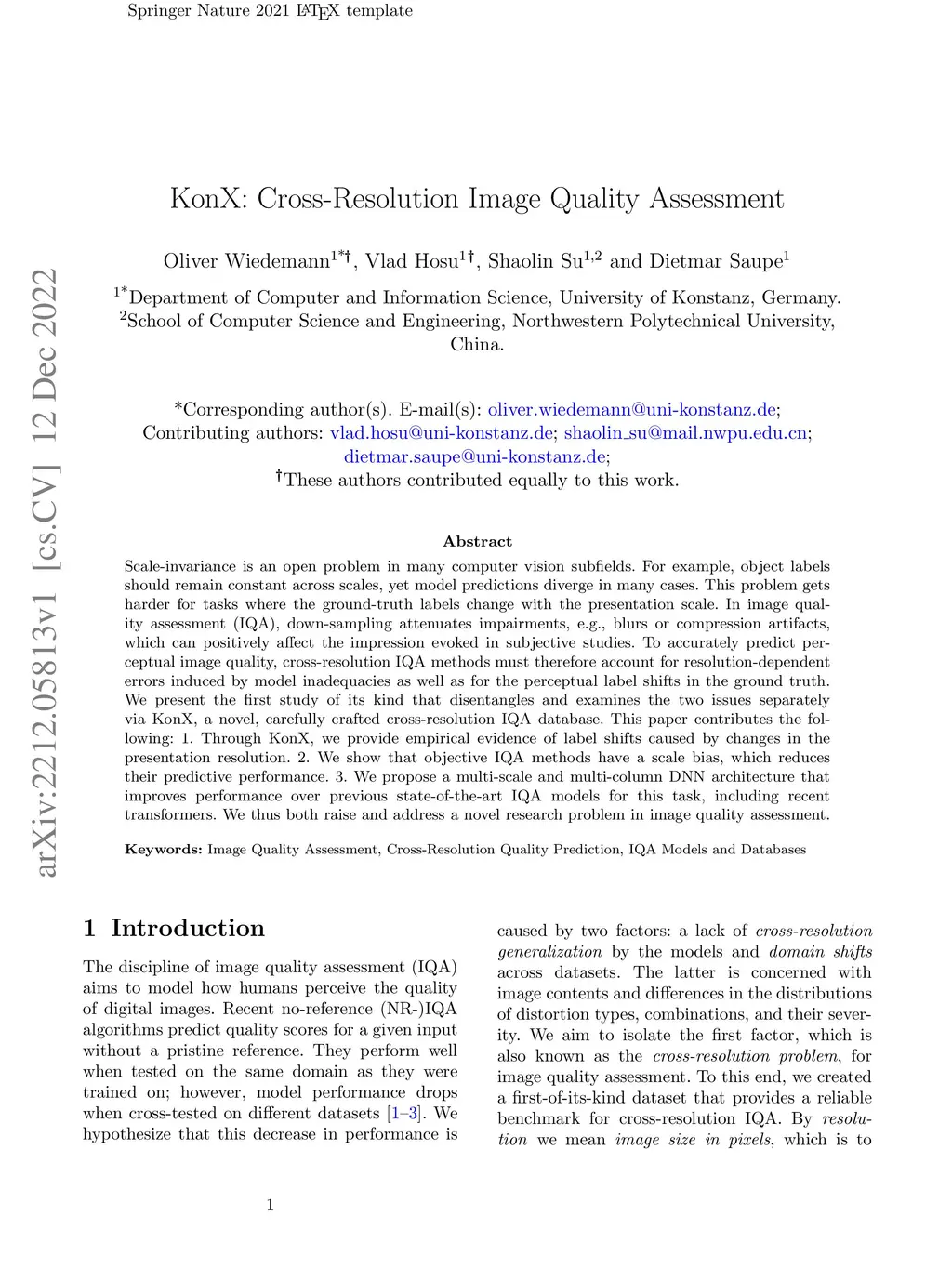 Scale-invariance is an open problem in many computer vision subfields. For example, object labels should remain constant across scales, yet model predictions diverge in many cases. This problem gets harder for tasks where the ground-truth labels change with the presentation scale. In image quality assessment (IQA), downsampling attenuates impairments, e.g., blurs or compression artifacts, which can positively affect the impression evoked in subjective studies. To accurately predict perceptual image quality, cross-resolution IQA methods must therefore account for resolution-dependent errors induced by model inadequacies as well as for the perceptual label shifts in the ground truth. We present the first study of its kind that disentangles and examines the two issues separately via KonX, a novel, carefully crafted cross-resolution IQA database. This paper contributes the following: 1. Through KonX, we provide empirical evidence of label shifts caused by changes in the presentation resolution. 2. We show that objective IQA methods have a scale bias, which reduces their predictive performance. 3. We propose a multi-scale and multi-column DNN architecture that improves performance over previous state-of-the-art IQA models for this task, including recent transformers. We thus both raise and address a novel research problem in image quality assessment.
