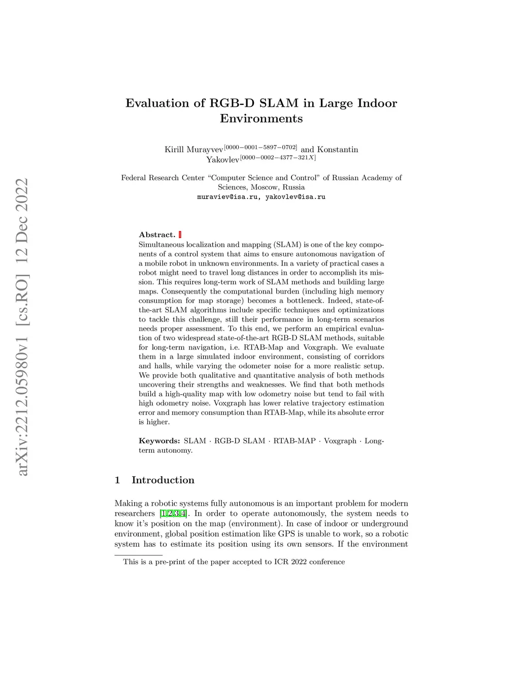 Simultaneous localization and mapping (SLAM) is one of the key components of a control system that aims to ensure autonomous navigation of a mobile robot in unknown environments. In a variety of practical cases a robot might need to travel long distances in order to accomplish its mission. This requires long-term work of SLAM methods and building large maps. Consequently the computational burden (including high memory consumption for map storage) becomes a bottleneck. Indeed, state-of-the-art SLAM algorithms include specific techniques and optimizations to tackle this challenge, still their performance in long-term scenarios needs proper assessment. To this end, we perform an empirical evaluation of two widespread state-of-the-art RGB-D SLAM methods, suitable for long-term navigation, i.e. RTAB-Map and Voxgraph. We evaluate them in a large simulated indoor environment, consisting of corridors and halls, while varying the odometer noise for a more realistic setup. We provide both qualitative and quantitative analysis of both methods uncovering their strengths and weaknesses. We find that both methods build a high-quality map with low odometry noise but tend to fail with high odometry noise. Voxgraph has lower relative trajectory estimation error and memory consumption than RTAB-Map, while its absolute error is higher.