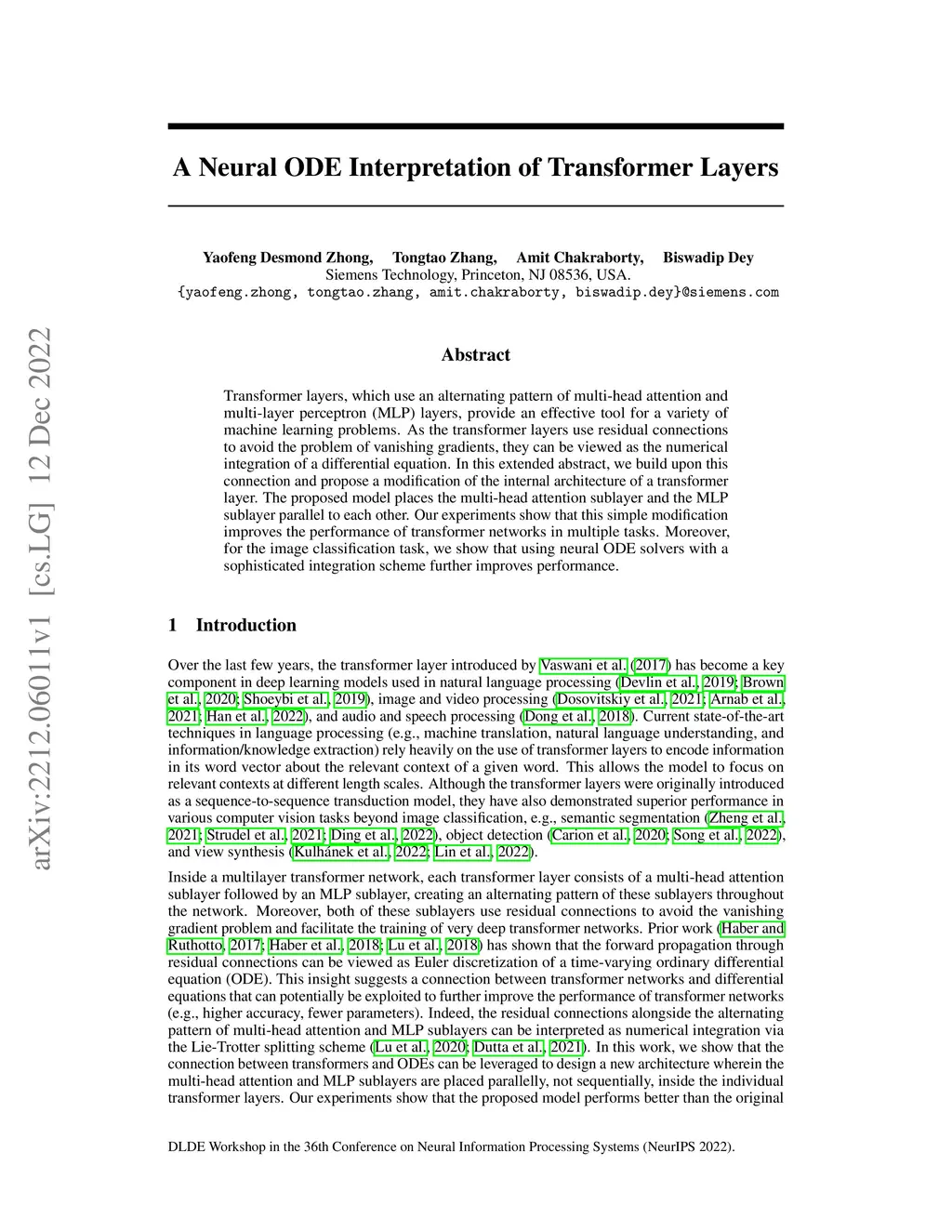 Transformer layers, which use an alternating pattern of multi-head attention and multi-layer perceptron (MLP) layers, provide an effective tool for a variety of machine learning problems. As the transformer layers use residual connections to avoid the problem of vanishing gradients, they can be viewed as the numerical integration of a differential equation. In this extended abstract, we build upon this connection and propose a modification of the internal architecture of a transformer layer. The proposed model places the multi-head attention sublayer and the MLP sublayer parallel to each other. Our experiments show that this simple modification improves the performance of transformer networks in multiple tasks. Moreover, for the image classification task, we show that using neural ODE solvers with a sophisticated integration scheme further improves performance.