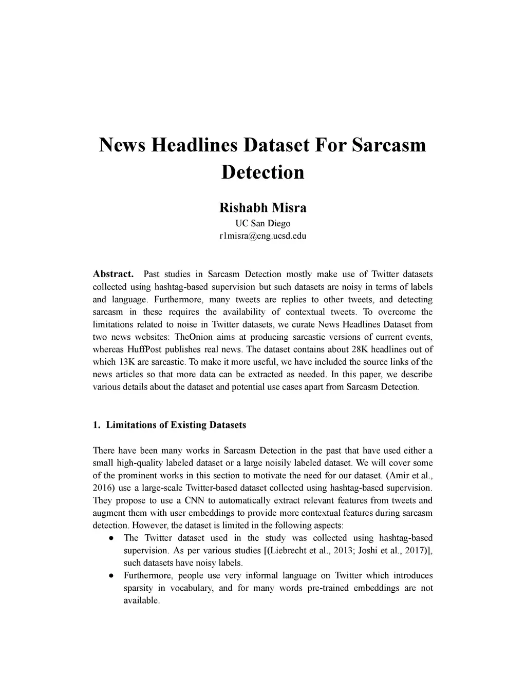 Past studies in Sarcasm Detection mostly make use of Twitter datasets collected using hashtag-based supervision but such datasets are noisy in terms of labels and language. Furthermore, many tweets are replies to other tweets, and detecting sarcasm in these requires the availability of contextual tweets. To overcome the limitations related to noise in Twitter datasets, we curate News Headlines Dataset from two news websites: TheOnion aims at producing sarcastic versions of current events, whereas HuffPost publishes real news. The dataset contains about 28K headlines out of which 13K are sarcastic. To make it more useful, we have included the source links of the news articles so that more data can be extracted as needed. In this paper, we describe various details about the dataset and potential use cases apart from Sarcasm Detection.