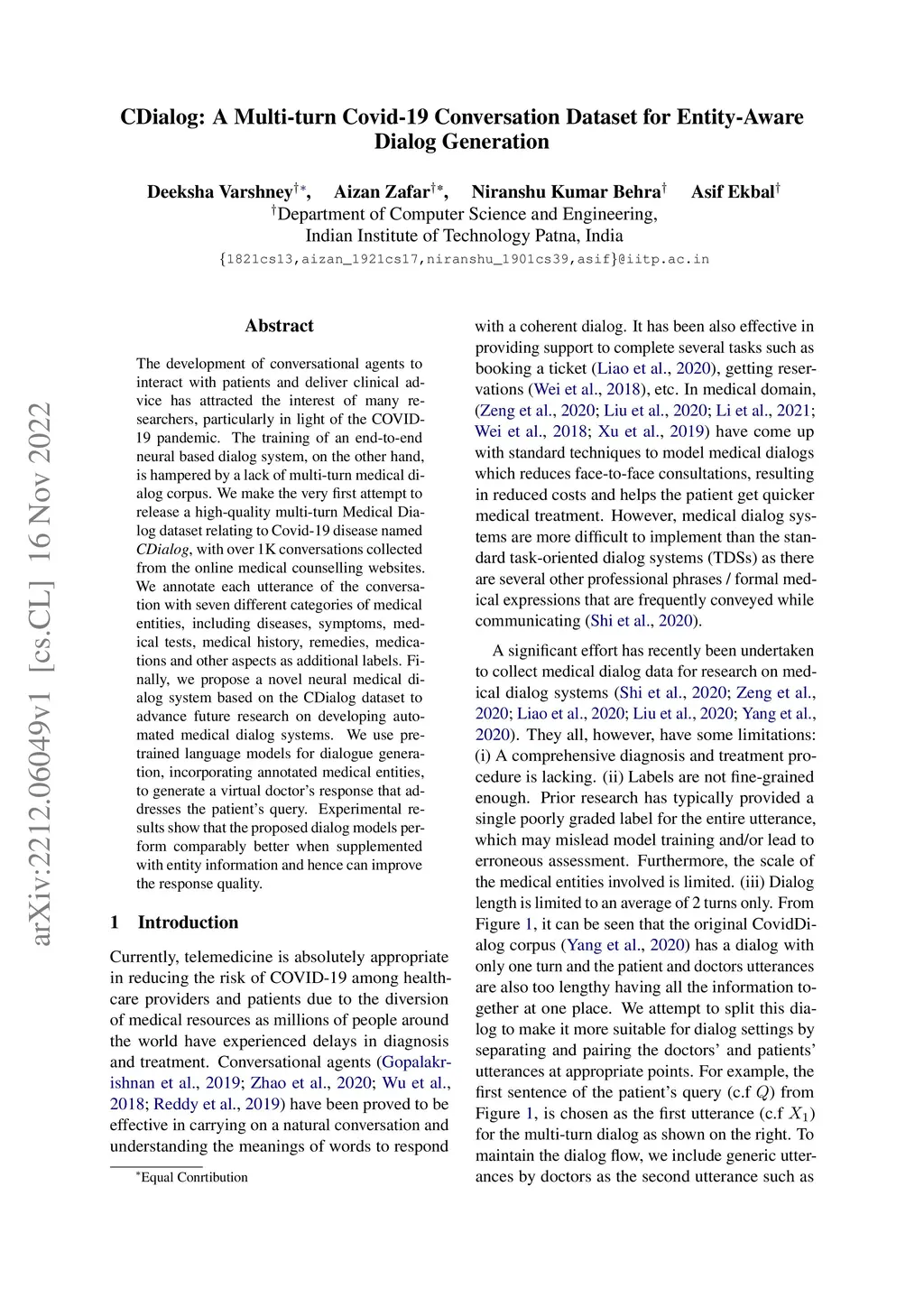 The development of conversational agents to interact with patients and deliver clinical advice has attracted the interest of many researchers, particularly in light of the COVID-19 pandemic. The training of an end-to-end neural based dialog system, on the other hand, is hampered by a lack of multi-turn medical dialog corpus. We make the very first attempt to release a high-quality multi-turn Medical Dialog dataset relating to Covid-19 disease named CDialog, with over 1K conversations collected from the online medical counselling websites. We annotate each utterance of the conversation with seven different categories of medical entities, including diseases, symptoms, medical tests, medical history, remedies, medications and other aspects as additional labels. Finally, we propose a novel neural medical dialog system based on the CDialog dataset to advance future research on developing automated medical dialog systems. We use pre-trained language models for dialogue generation, incorporating annotated medical entities, to generate a virtual doctor's response that addresses the patient's query. Experimental results show that the proposed dialog models perform comparably better when supplemented with entity information and hence can improve the response quality.