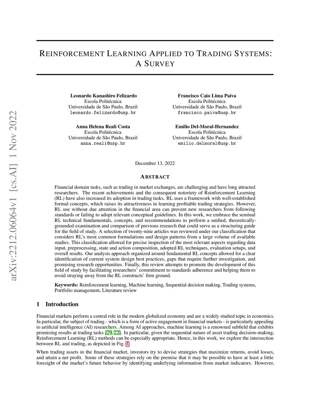 Reinforcement Learning Applied to Trading Systems: A Survey