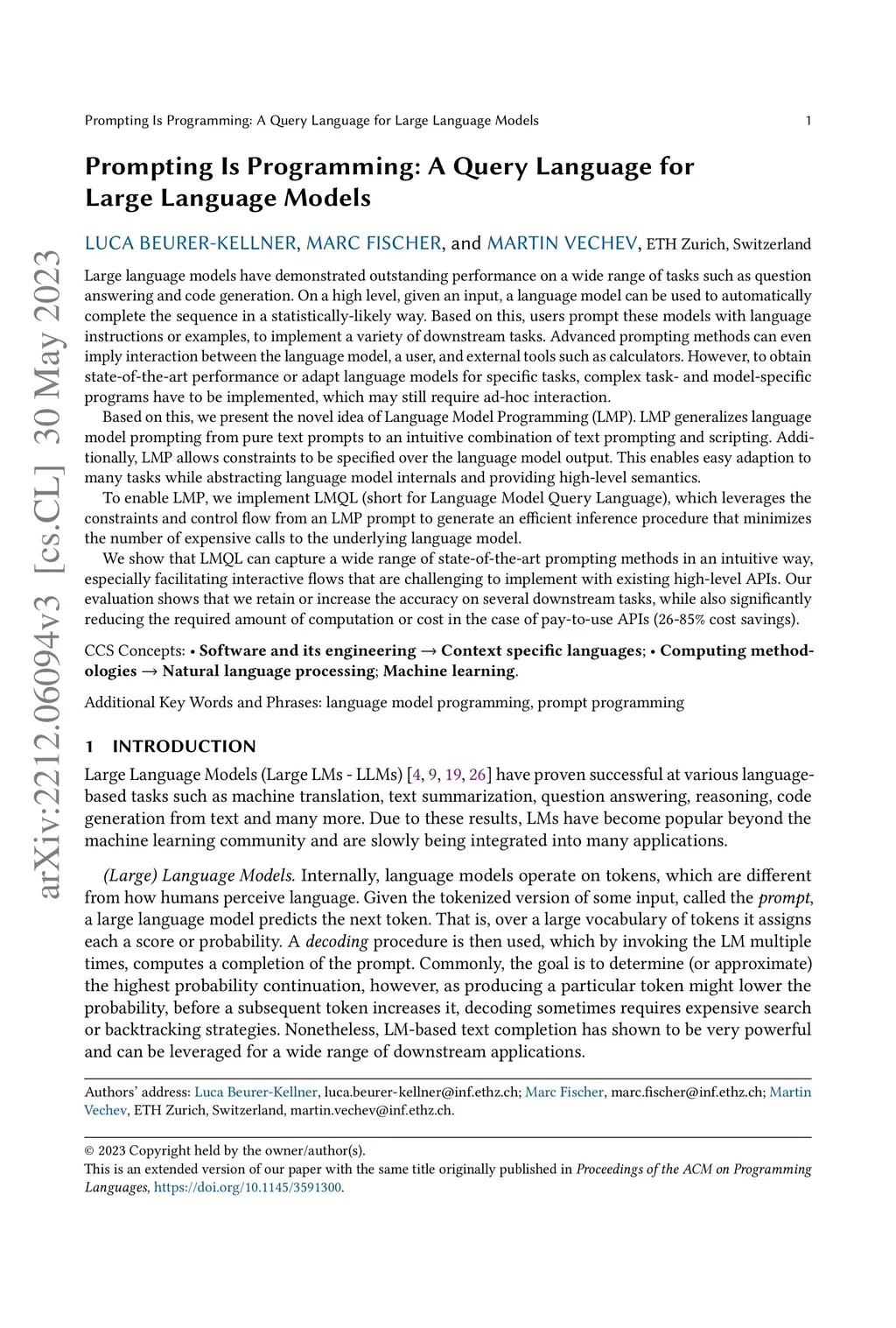 Large language models have demonstrated outstanding performance on a wide range of tasks such as question answering and code generation. On a high level, given an input, a language model can be used to automatically complete the sequence in a statistically-likely way. Based on this, users prompt these models with language instructions or examples, to implement a variety of downstream tasks. Advanced prompting methods can even imply interaction between the language model, a user, and external tools such as calculators. However, to obtain state-of-the-art performance or adapt language models for specific tasks, complex task- and model-specific programs have to be implemented, which may still require ad-hoc interaction. Based on this, we present the novel idea of Language Model Programming (LMP). LMP generalizes language model prompting from pure text prompts to an intuitive combination of text prompting and scripting. Additionally, LMP allows constraints to be specified over the language model output. This enables easy adaption to many tasks while abstracting language model internals and providing high-level semantics. To enable LMP, we implement LMQL(short for Language Model Query Language), which leverages the constraints and control flow from an LMP prompt to generate an efficient inference procedure that minimizes the number of expensive calls to the underlying language model. We show that LMQL can capture a wide range of state-of-the-art prompting methods in an intuitive way, especially facilitating interactive flows that are challenging to implement with existing high-level APIs. Our evaluation shows that we retain or increase the accuracy on several downstream tasks, while also significantly reducing the required amount of computation or cost in the case of pay-to-use APIs (26-85% cost savings).