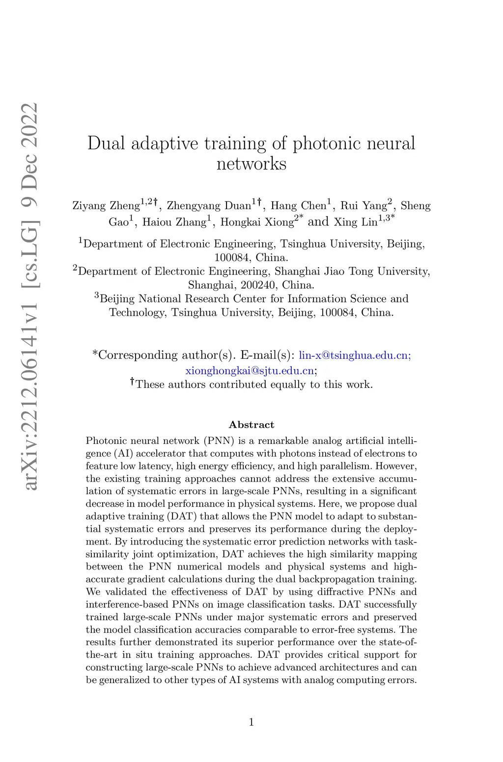 Photonic neural network (PNN) is a remarkable analog artificial intelligence (AI) accelerator that computes with photons instead of electrons to feature low latency, high energy efficiency, and high parallelism. However, the existing training approaches cannot address the extensive accumulation of systematic errors in large-scale PNNs, resulting in a significant decrease in model performance in physical systems. Here, we propose dual adaptive training (DAT) that allows the PNN model to adapt to substantial systematic errors and preserves its performance during the deployment. By introducing the systematic error prediction networks with task-similarity joint optimization, DAT achieves the high similarity mapping between the PNN numerical models and physical systems and high-accurate gradient calculations during the dual backpropagation training. We validated the effectiveness of DAT by using diffractive PNNs and interference-based PNNs on image classification tasks. DAT successfully trained large-scale PNNs under major systematic errors and preserved the model classification accuracies comparable to error-free systems. The results further demonstrated its superior performance over the state-of-the-art in situ training approaches. DAT provides critical support for constructing large-scale PNNs to achieve advanced architectures and can be generalized to other types of AI systems with analog computing errors.