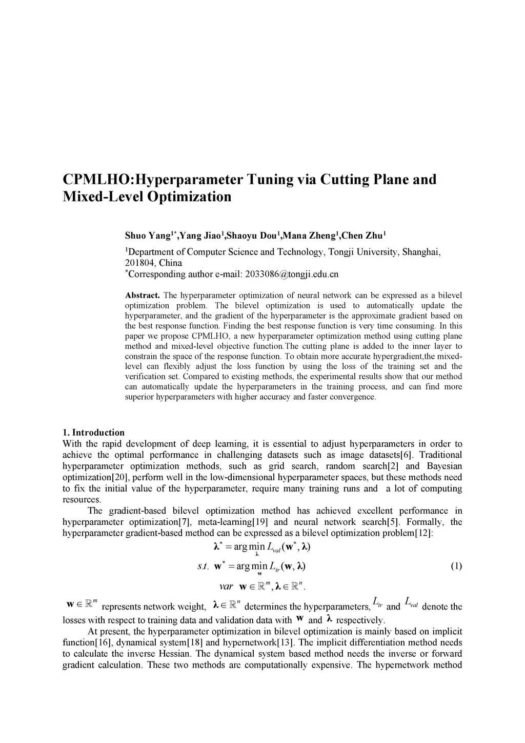 The hyperparameter optimization of neural network can be expressed as a bilevel optimization problem. The bilevel optimization is used to automatically update the hyperparameter, and the gradient of the hyperparameter is the approximate gradient based on the best response function. Finding the best response function is very time consuming. In this paper we propose CPMLHO, a new hyperparameter optimization method using cutting plane method and mixed-level objective function.The cutting plane is added to the inner layer to constrain the space of the response function. To obtain more accurate hypergradient,the mixed-level can flexibly adjust the loss function by using the loss of the training set and the verification set. Compared to existing methods, the experimental results show that our method can automatically update the hyperparameters in the training process, and can find more superior hyperparameters with higher accuracy and faster convergence.