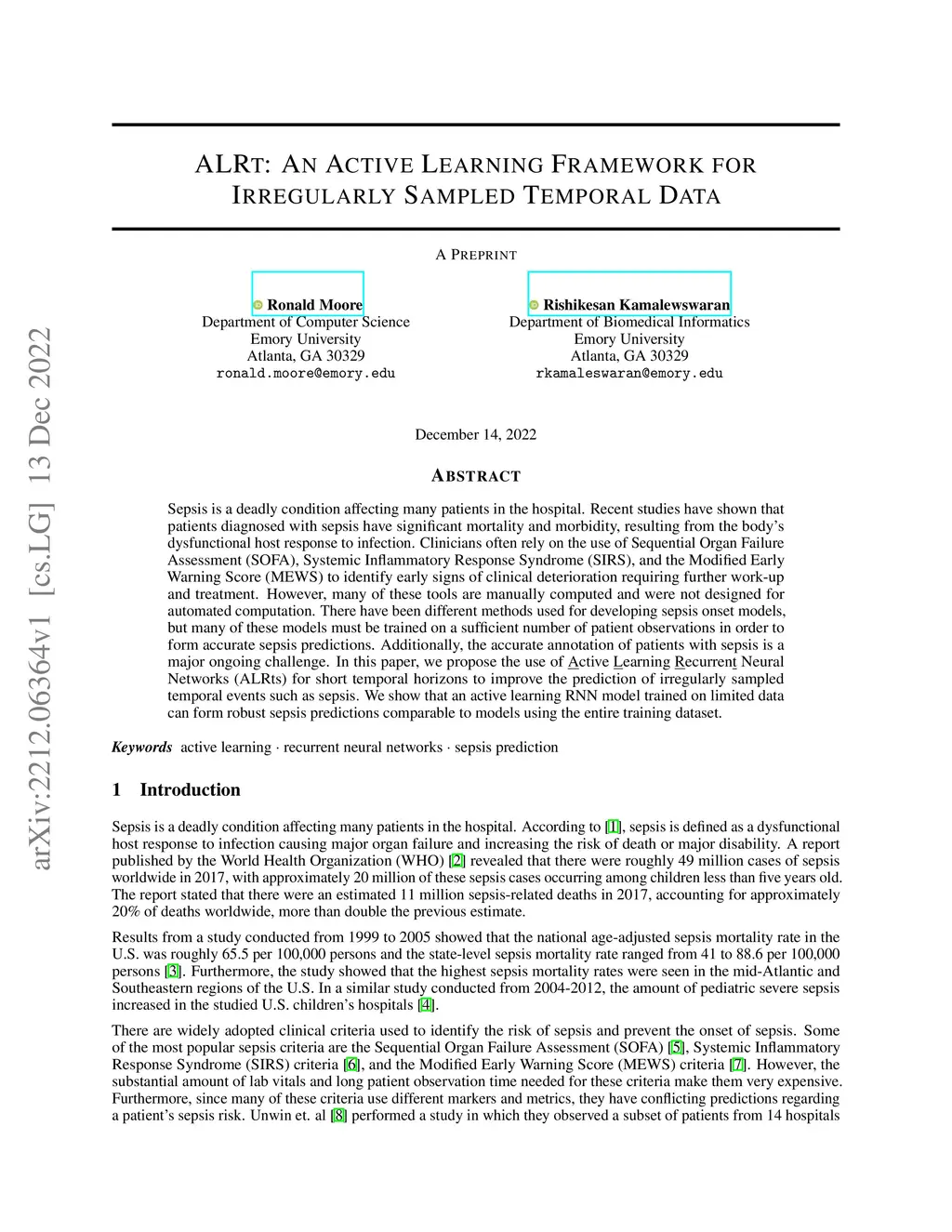 Sepsis is a deadly condition affecting many patients in the hospital. Recent studies have shown that patients diagnosed with sepsis have significant mortality and morbidity, resulting from the body's dysfunctional host response to infection. Clinicians often rely on the use of Sequential Organ Failure Assessment (SOFA), Systemic Inflammatory Response Syndrome (SIRS), and the Modified Early Warning Score (MEWS) to identify early signs of clinical deterioration requiring further work-up and treatment. However, many of these tools are manually computed and were not designed for automated computation. There have been different methods used for developing sepsis onset models, but many of these models must be trained on a sufficient number of patient observations in order to form accurate sepsis predictions. Additionally, the accurate annotation of patients with sepsis is a major ongoing challenge. In this paper, we propose the use of Active Learning Recurrent Neural Networks (ALRts) for short temporal horizons to improve the prediction of irregularly sampled temporal events such as sepsis. We show that an active learning RNN model trained on limited data can form robust sepsis predictions comparable to models using the entire training dataset.