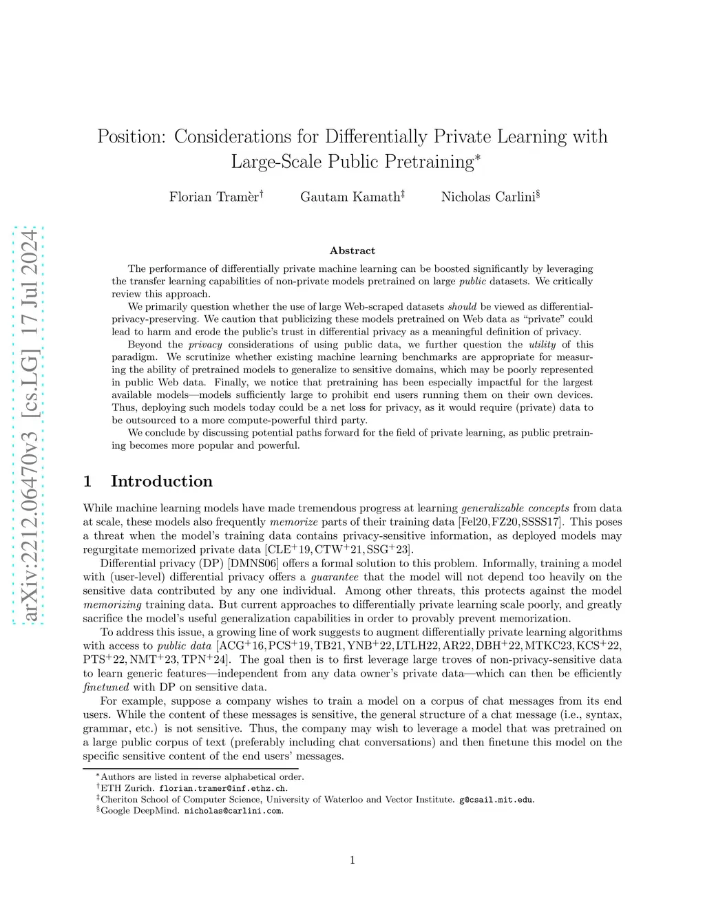 The performance of differentially private machine learning can be boosted significantly by leveraging the transfer learning capabilities of non-private models pretrained on large public datasets. We critically review this approach. We primarily question whether the use of large Web-scraped datasets should be viewed as differential-privacy-preserving. We caution that publicizing these models pretrained on Web data as "private" could lead to harm and erode the public's trust in differential privacy as a meaningful definition of privacy. Beyond the privacy considerations of using public data, we further question the utility of this paradigm. We scrutinize whether existing machine learning benchmarks are appropriate for measuring the ability of pretrained models to generalize to sensitive domains, which may be poorly represented in public Web data. Finally, we notice that pretraining has been especially impactful for the largest available models -- models sufficiently large to prohibit end users running them on their own devices. Thus, deploying such models today could be a net loss for privacy, as it would require (private) data to be outsourced to a more compute-powerful third party. We conclude by discussing potential paths forward for the field of private learning, as public pretraining becomes more popular and powerful.