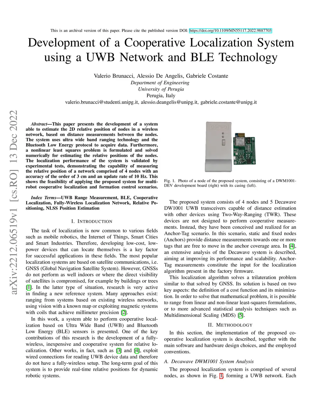 This paper presents the development of a system able to estimate the 2D relative position of nodes in a wireless network, based on distance measurements between the nodes. The system uses ultra wide band ranging technology and the Bluetooth Low Energy protocol to acquire data. Furthermore, a nonlinear least squares problem is formulated and solved numerically for estimating the relative positions of the nodes. The localization performance of the system is validated by experimental tests, demonstrating the capability of measuring the relative position of a network comprised of 4 nodes with an accuracy of the order of 3 cm and an update rate of 10 Hz. This shows the feasibility of applying the proposed system for multi-robot cooperative localization and formation control scenarios.