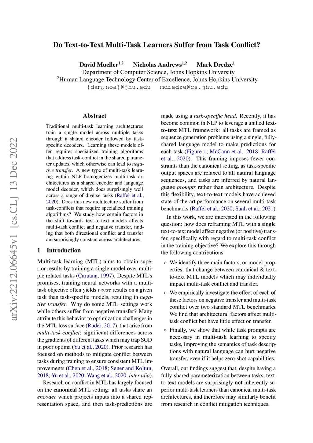 Traditional multi-task learning architectures train a single model across multiple tasks through a shared encoder followed by task-specific decoders. Learning these models often requires specialized training algorithms that address task-conflict in the shared parameter updates, which otherwise can lead to negative transfer. A new type of multi-task learning within NLP homogenizes multi-task architectures as a shared encoder and language model decoder, which does surprisingly well across a range of diverse tasks. Does this new architecture suffer from task-conflicts that require specialized training algorithms? We study how certain factors in the shift towards text-to-text models affects multi-task conflict and negative transfer, finding that both directional conflict and transfer are surprisingly constant across architectures.
