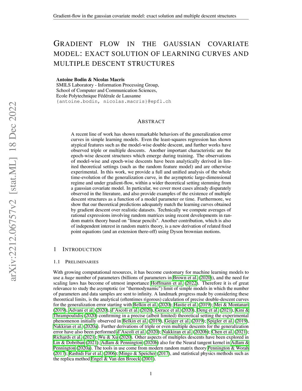 A recent line of work has shown remarkable behaviors of the generalization error curves in simple learning models. Even the least-squares regression has shown atypical features such as the model-wise double descent, and further works have observed triple or multiple descents. Another important characteristic are the epoch-wise descent structures which emerge during training. The observations of model-wise and epoch-wise descents have been analytically derived in limited theoretical settings (such as the random feature model) and are otherwise experimental. In this work, we provide a full and unified analysis of the whole time-evolution of the generalization curve, in the asymptotic large-dimensional regime and under gradient-flow, within a wider theoretical setting stemming from a gaussian covariate model. In particular, we cover most cases already disparately observed in the literature, and also provide examples of the existence of multiple descent structures as a function of a model parameter or time. Furthermore, we show that our theoretical predictions adequately match the learning curves obtained by gradient descent over realistic datasets. Technically we compute averages of rational expressions involving random matrices using recent developments in random matrix theory based on "linear pencils". Another contribution, which is also of independent interest in random matrix theory, is a new derivation of related fixed point equations (and an extension there-off) using Dyson brownian motions.