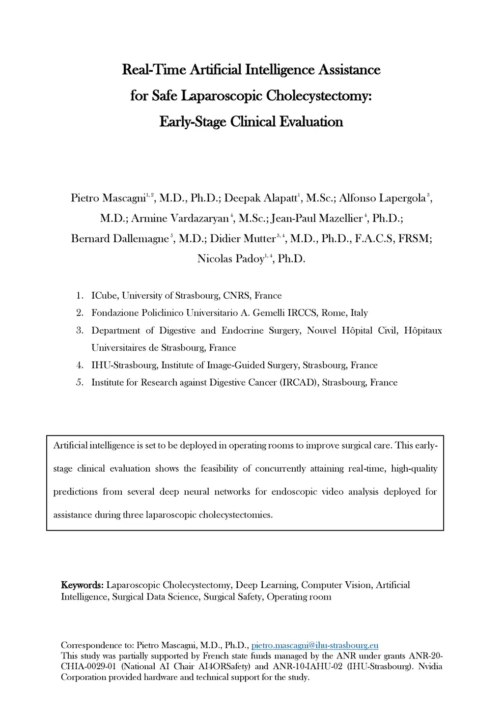 Artificial intelligence is set to be deployed in operating rooms to improve surgical care. This early-stage clinical evaluation shows the feasibility of concurrently attaining real-time, high-quality predictions from several deep neural networks for endoscopic video analysis deployed for assistance during three laparoscopic cholecystectomies.