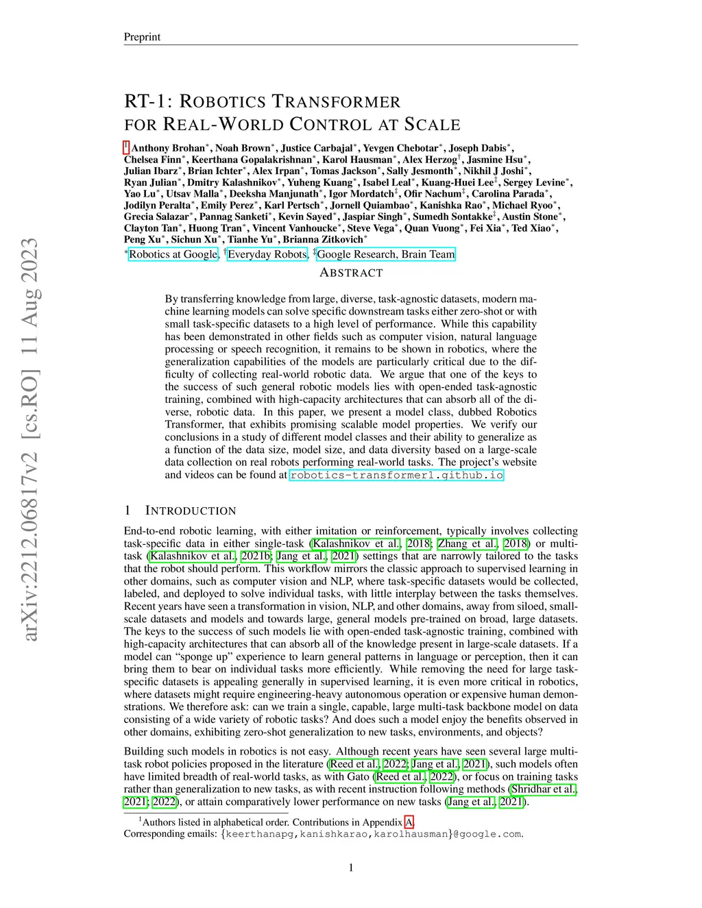 By transferring knowledge from large, diverse, task-agnostic datasets, modern machine learning models can solve specific downstream tasks either zero-shot or with small task-specific datasets to a high level of performance. While this capability has been demonstrated in other fields such as computer vision, natural language processing or speech recognition, it remains to be shown in robotics, where the generalization capabilities of the models are particularly critical due to the difficulty of collecting real-world robotic data. We argue that one of the keys to the success of such general robotic models lies with open-ended task-agnostic training, combined with high-capacity architectures that can absorb all of the diverse, robotic data. In this paper, we present a model class, dubbed Robotics Transformer, that exhibits promising scalable model properties. We verify our conclusions in a study of different model classes and their ability to generalize as a function of the data size, model size, and data diversity based on a large-scale data collection on real robots performing real-world tasks. The project's website and videos can be found at robotics-transformer1.github.io