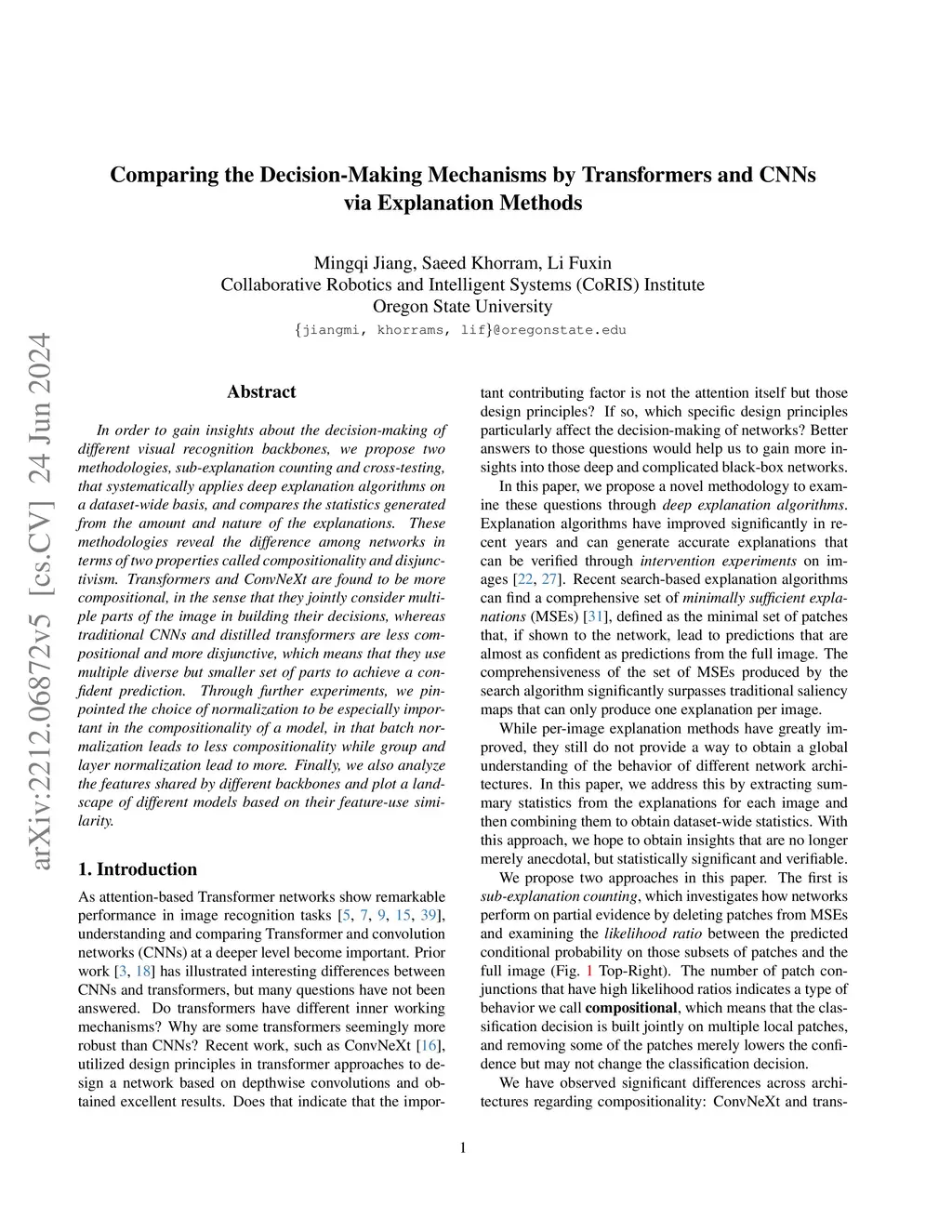 In order to gain insights about the decision-making of different visual recognition backbones, we propose two methodologies, sub-explanation counting and cross-testing, that systematically applies deep explanation algorithms on a dataset-wide basis, and compares the statistics generated from the amount and nature of the explanations. These methodologies reveal the difference among networks in terms of two properties called compositionality and disjunctivism. Transformers and ConvNeXt are found to be more compositional, in the sense that they jointly consider multiple parts of the image in building their decisions, whereas traditional CNNs and distilled transformers are less compositional and more disjunctive, which means that they use multiple diverse but smaller set of parts to achieve a confident prediction. Through further experiments, we pinpointed the choice of normalization to be especially important in the compositionality of a model, in that batch normalization leads to less compositionality while group and layer normalization lead to more. Finally, we also analyze the features shared by different backbones and plot a landscape of different models based on their feature-use similarity.