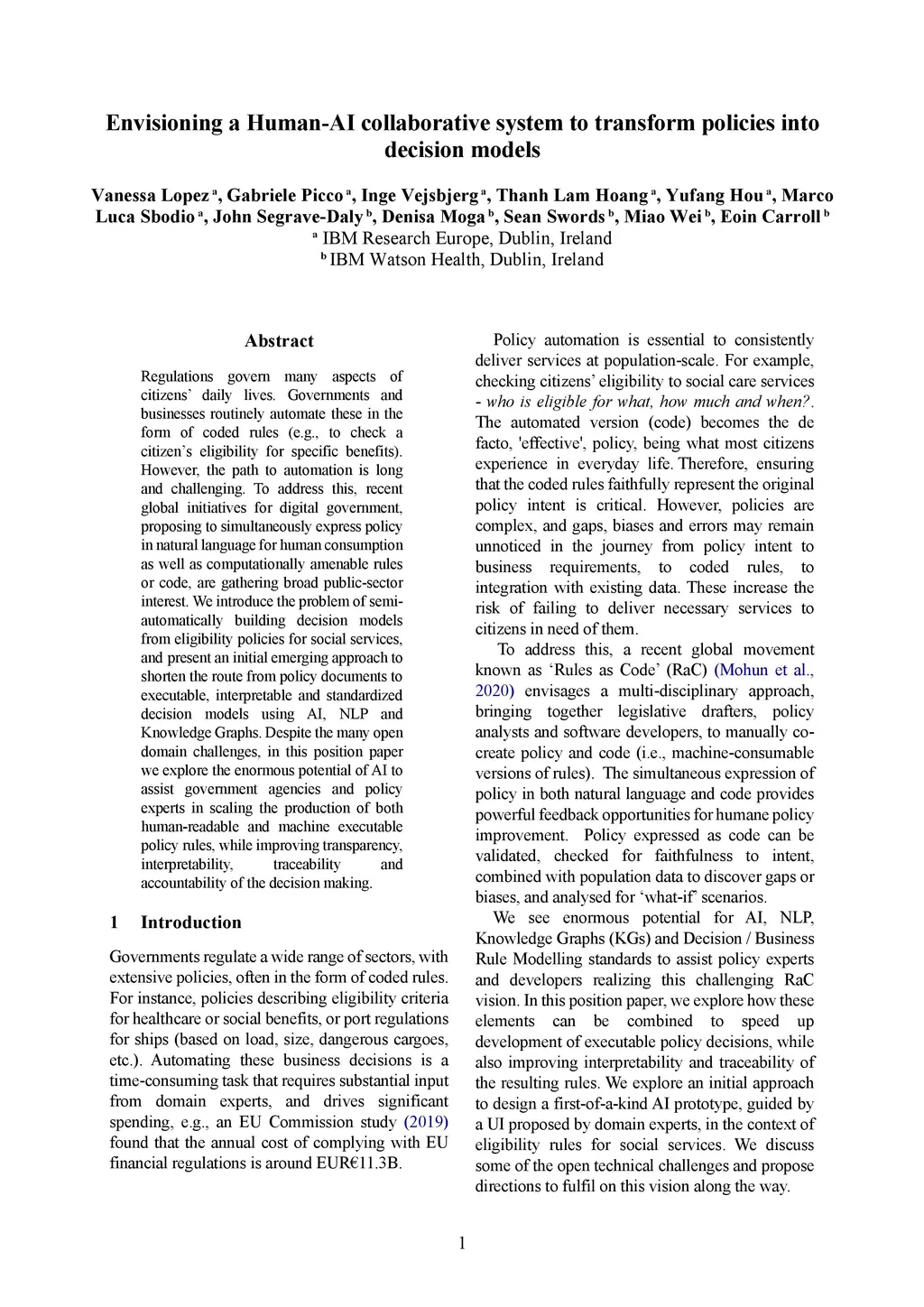 Regulations govern many aspects of citizens' daily lives. Governments and businesses routinely automate these in the form of coded rules (e.g., to check a citizen's eligibility for specific benefits). However, the path to automation is long and challenging. To address this, recent global initiatives for digital government, proposing to simultaneously express policy in natural language for human consumption as well as computationally amenable rules or code, are gathering broad public-sector interest. We introduce the problem of semi-automatically building decision models from eligibility policies for social services, and present an initial emerging approach to shorten the route from policy documents to executable, interpretable and standardised decision models using AI, NLP and Knowledge Graphs. Despite the many open domain challenges, in this position paper we explore the enormous potential of AI to assist government agencies and policy experts in scaling the production of both human-readable and machine executable policy rules, while improving transparency, interpretability, traceability and accountability of the decision making.