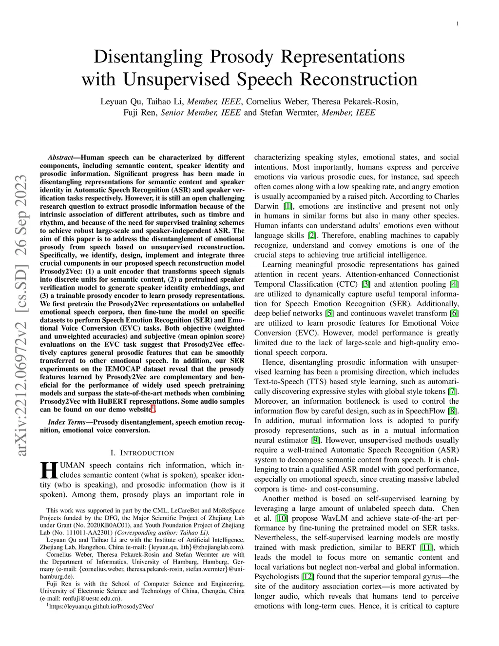 Human speech can be characterized by different components, including semantic content, speaker identity and prosodic information. Significant progress has been made in disentangling representations for semantic content and speaker identity in Automatic Speech Recognition (ASR) and speaker verification tasks respectively. However, it is still an open challenging research question to extract prosodic information because of the intrinsic association of different attributes, such as timbre and rhythm, and because of the need for supervised training schemes to achieve robust large-scale and speaker-independent ASR. The aim of this paper is to address the disentanglement of emotional prosody from speech based on unsupervised reconstruction. Specifically, we identify, design, implement and integrate three crucial components in our proposed speech reconstruction model Prosody2Vec: (1) a unit encoder that transforms speech signals into discrete units for semantic content, (2) a pretrained speaker verification model to generate speaker identity embeddings, and (3) a trainable prosody encoder to learn prosody representations. We first pretrain the Prosody2Vec representations on unlabelled emotional speech corpora, then fine-tune the model on specific datasets to perform Speech Emotion Recognition (SER) and Emotional Voice Conversion (EVC) tasks. Both objective (weighted and unweighted accuracies) and subjective (mean opinion score) evaluations on the EVC task suggest that Prosody2Vec effectively captures general prosodic features that can be smoothly transferred to other emotional speech. In addition, our SER experiments on the IEMOCAP dataset reveal that the prosody features learned by Prosody2Vec are complementary and beneficial for the performance of widely used speech pretraining models and surpass the state-of-the-art methods when combining Prosody2Vec with HuBERT representations.
