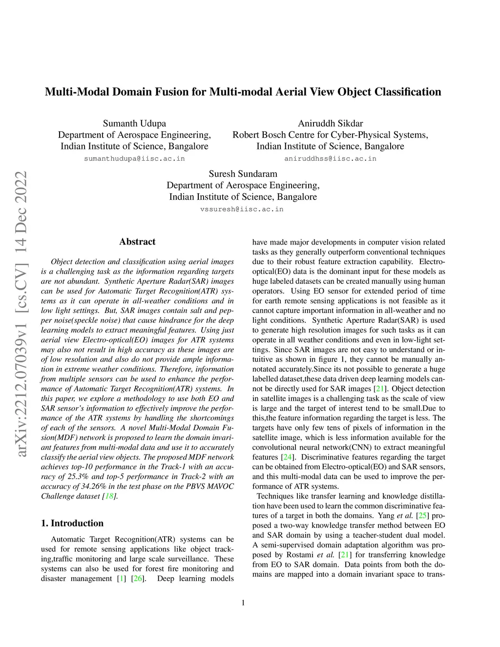 Object detection and classification using aerial images is a challenging task as the information regarding targets are not abundant. Synthetic Aperture Radar(SAR) images can be used for Automatic Target Recognition(ATR) systems as it can operate in all-weather conditions and in low light settings. But, SAR images contain salt and pepper noise(speckle noise) that cause hindrance for the deep learning models to extract meaningful features. Using just aerial view Electro-optical(EO) images for ATR systems may also not result in high accuracy as these images are of low resolution and also do not provide ample information in extreme weather conditions. Therefore, information from multiple sensors can be used to enhance the performance of Automatic Target Recognition(ATR) systems. In this paper, we explore a methodology to use both EO and SAR sensor information to effectively improve the performance of the ATR systems by handling the shortcomings of each of the sensors. A novel Multi-Modal Domain Fusion(MDF) network is proposed to learn the domain invariant features from multi-modal data and use it to accurately classify the aerial view objects. The proposed MDF network achieves top-10 performance in the Track-1 with an accuracy of 25.3 % and top-5 performance in Track-2 with an accuracy of 34.26 % in the test phase on the PBVS MAVOC Challenge dataset [18].