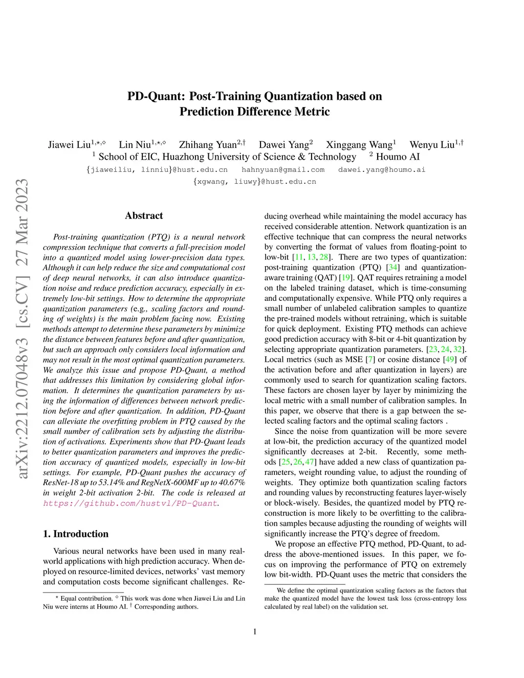PD-Quant: Post-Training Quantization based on Prediction Difference