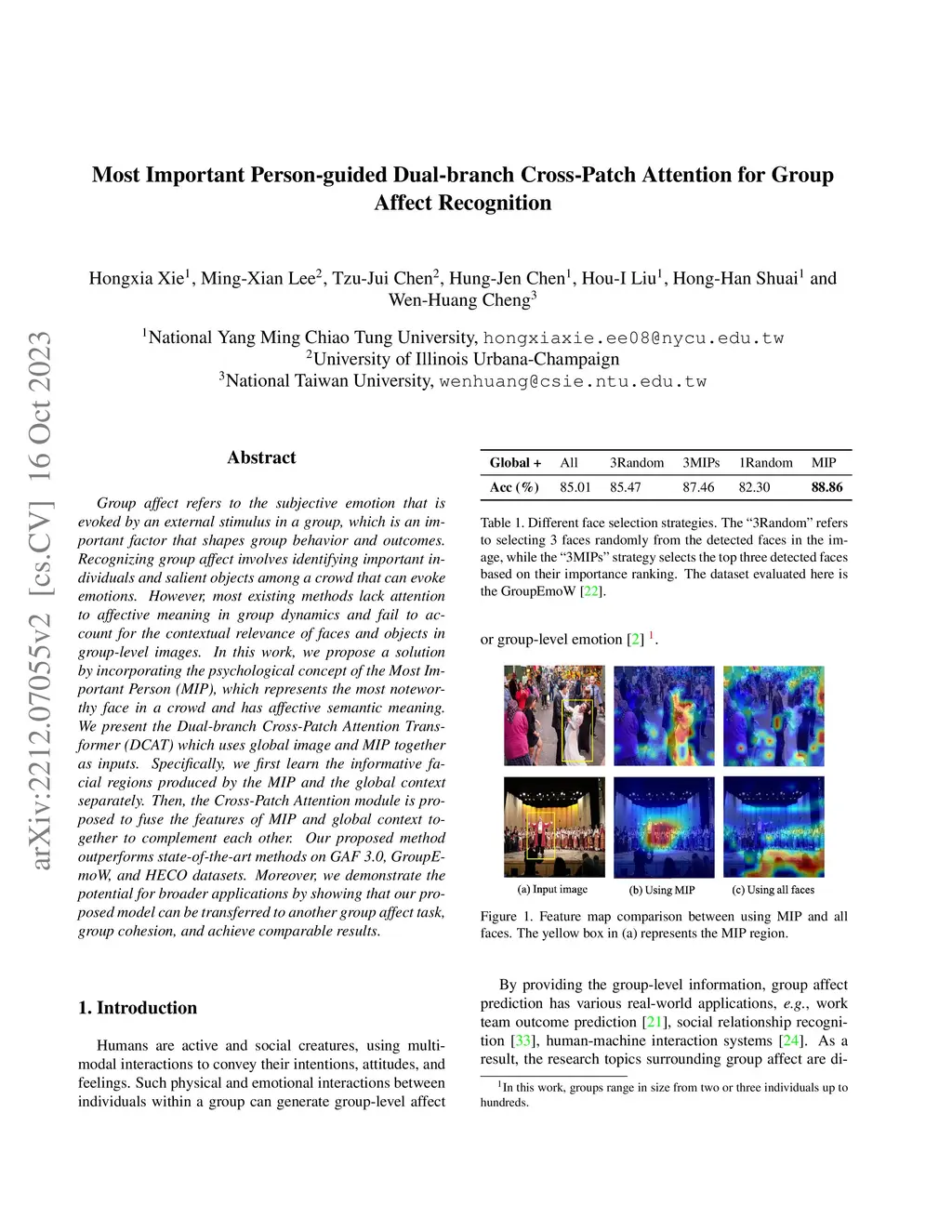 Group affect refers to the subjective emotion that is evoked by an external stimulus in a group, which is an important factor that shapes group behavior and outcomes. Recognizing group affect involves identifying important individuals and salient objects among a crowd that can evoke emotions. However, most existing methods lack attention to affective meaning in group dynamics and fail to account for the contextual relevance of faces and objects in group-level images. In this work, we propose a solution by incorporating the psychological concept of the Most Important Person (MIP), which represents the most noteworthy face in a crowd and has affective semantic meaning. We present the Dual-branch Cross-Patch Attention Transformer (DCAT) which uses global image and MIP together as inputs. Specifically, we first learn the informative facial regions produced by the MIP and the global context separately. Then, the Cross-Patch Attention module is proposed to fuse the features of MIP and global context together to complement each other. Our proposed method outperforms state-of-the-art methods on GAF 3.0, GroupEmoW, and HECO datasets. Moreover, we demonstrate the potential for broader applications by showing that our proposed model can be transferred to another group affect task, group cohesion, and achieve comparable results.