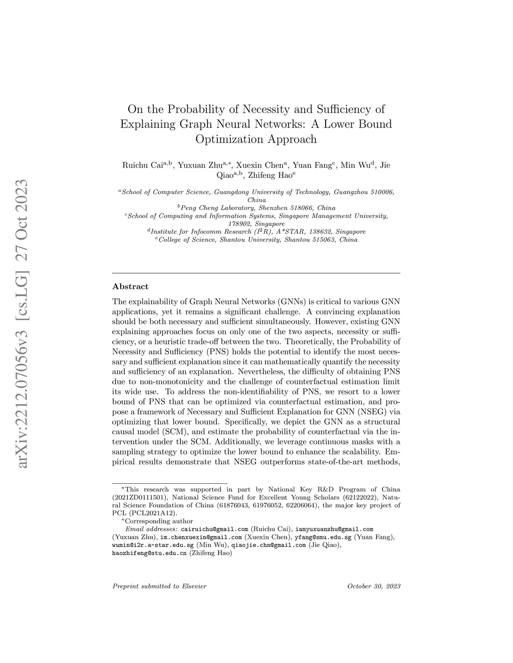 The explainability of Graph Neural Networks (GNNs) is critical to various GNN applications but remains an open challenge. A convincing explanation should be both necessary and sufficient simultaneously. However, existing GNN explaining approaches focus on only one of the two aspects, necessity or sufficiency, or a heuristic trade-off between the two. Theoretically, the Probability of Necessity and Sufficiency (PNS) can be applied to search for the most necessary and sufficient explanation since it can mathematically quantify the necessity and sufficiency of an explanation. Nevertheless, the difficulty of obtaining PNS due to non-monotonicity and the challenge of counterfactual estimation limit its wide use. To address the non-identifiability of PNS, we resort to a lower bound of PNS that can be optimized via counterfactual estimation, and propose Necessary and Sufficient Explanation for GNN (NSEG) via optimizing that lower bound. Specifically, we employ nearest neighbor matching to generate counterfactual samples and leverage continuous masks with a sampling strategy to optimize the lower bound. Empirical study shows that NSEG achieves excellent performance in generating the most necessary and sufficient explanations among a series of state-of-the-art methods.