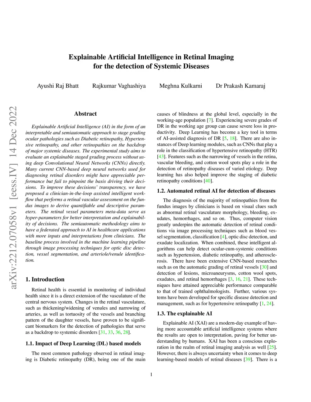 Explainable Artificial Intelligence (AI) in the form of an interpretable and semiautomatic approach to stage grading ocular pathologies such as Diabetic retinopathy, Hypertensive retinopathy, and other retinopathies on the backdrop of major systemic diseases. The experimental study aims to evaluate an explainable staged grading process without using deep Convolutional Neural Networks (CNNs) directly. Many current CNN-based deep neural networks used for diagnosing retinal disorders might have appreciable performance but fail to pinpoint the basis driving their decisions. To improve these decisions' transparency, we have proposed a clinician-in-the-loop assisted intelligent workflow that performs a retinal vascular assessment on the fundus images to derive quantifiable and descriptive parameters. The retinal vessel parameters meta-data serve as hyper-parameters for better interpretation and explainability of decisions. The semiautomatic methodology aims to have a federated approach to AI in healthcare applications with more inputs and interpretations from clinicians. The baseline process involved in the machine learning pipeline through image processing techniques for optic disc detection, vessel segmentation, and arteriole/venule identification.