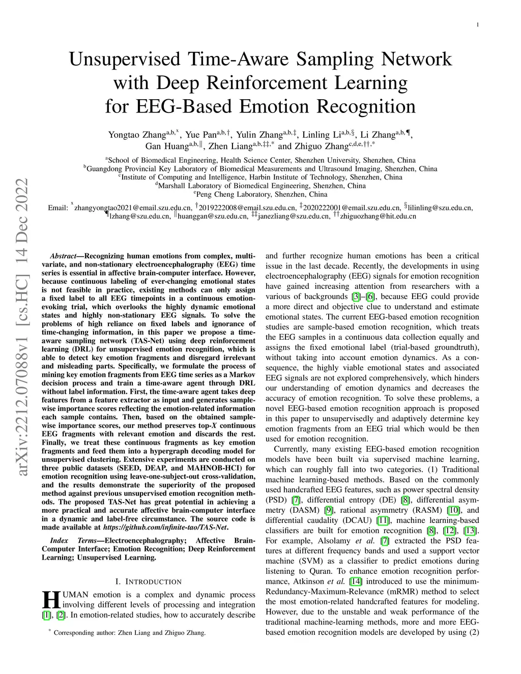 Recognizing human emotions from complex, multivariate, and non-stationary electroencephalography (EEG) time series is essential in affective brain-computer interface. However, because continuous labeling of ever-changing emotional states is not feasible in practice, existing methods can only assign a fixed label to all EEG timepoints in a continuous emotion-evoking trial, which overlooks the highly dynamic emotional states and highly non-stationary EEG signals. To solve the problems of high reliance on fixed labels and ignorance of time-changing information, in this paper we propose a time-aware sampling network (TAS-Net) using deep reinforcement learning (DRL) for unsupervised emotion recognition, which is able to detect key emotion fragments and disregard irrelevant and misleading parts. Extensive experiments are conducted on three public datasets (SEED, DEAP, and MAHNOB-HCI) for emotion recognition using leave-one-subject-out cross-validation, and the results demonstrate the superiority of the proposed method against previous unsupervised emotion recognition methods.