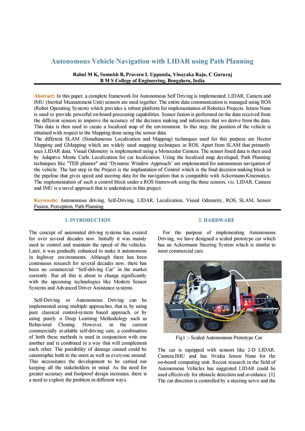 In this paper, a complete framework for Autonomous Self Driving is implemented. LIDAR, Camera and IMU sensors are used together. The entire data communication is managed using Robot Operating System which provides a robust platform for implementation of Robotics Projects. Jetson Nano is used to provide powerful on-board processing capabilities. Sensor fusion is performed on the data received from the different sensors to improve the accuracy of the decision making and inferences that we derive from the data. This data is then used to create a localized map of the environment. In this step, the position of the vehicle is obtained with respect to the Mapping done using the sensor data.The different SLAM techniques used for this purpose are Hector Mapping and GMapping which are widely used mapping techniques in ROS. Apart from SLAM that primarily uses LIDAR data, Visual Odometry is implemented using a Monocular Camera. The sensor fused data is then used by Adaptive Monte Carlo Localization for car localization. Using the localized map developed, Path Planning techniques like "TEB planner" and "Dynamic Window Approach" are implemented for autonomous navigation of the vehicle. The last step in the Project is the implantation of Control which is the final decision making block in the pipeline that gives speed and steering data for the navigation that is compatible with Ackermann Kinematics. The implementation of such a control block under a ROS framework using the three sensors, viz, LIDAR, Camera and IMU is a novel approach that is undertaken in this project.