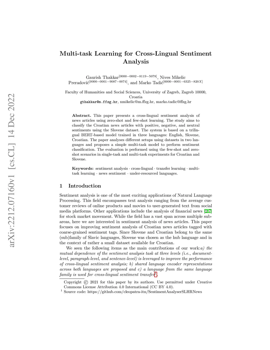 This paper presents a cross-lingual sentiment analysis of news articles using zero-shot and few-shot learning. The study aims to classify the Croatian news articles with positive, negative, and neutral sentiments using the Slovene dataset. The system is based on a trilingual BERT-based model trained in three languages: English, Slovene, Croatian. The paper analyses different setups using datasets in two languages and proposes a simple multi-task model to perform sentiment classification. The evaluation is performed using the few-shot and zero-shot scenarios in single-task and multi-task experiments for Croatian and Slovene.