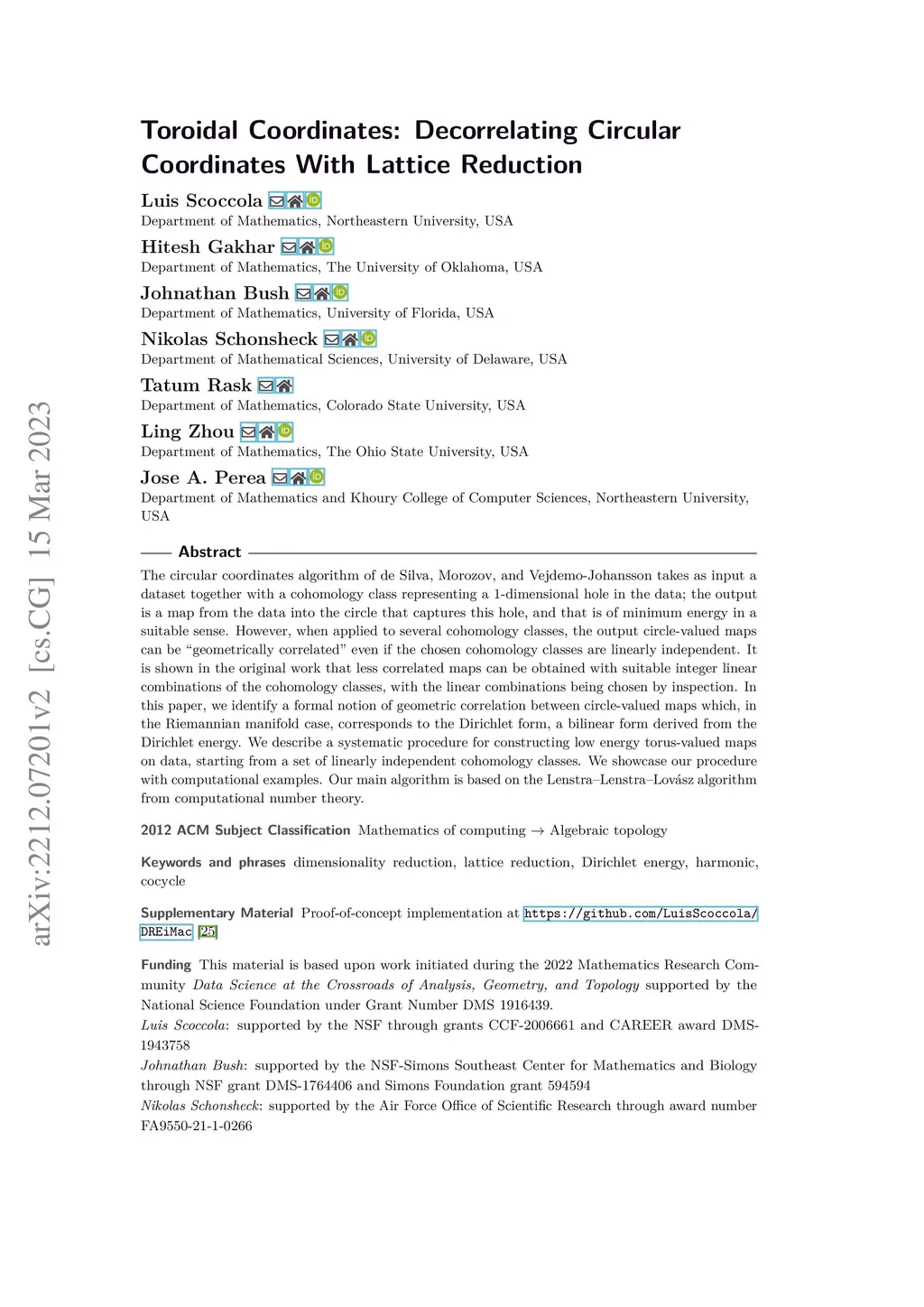 The circular coordinates algorithm of de Silva, Morozov, and Vejdemo-Johansson takes as input a dataset together with a cohomology class representing a -dimensional hole in the data; the output is a map from the data into the circle that captures this hole, and that is of minimum energy in a suitable sense. However, when applied to several cohomology classes, the output circle-valued maps can be "geometrically correlated" even if the chosen cohomology classes are linearly independent. It is shown in the original work that less correlated maps can be obtained with suitable integer linear combinations of the cohomology classes, with the linear combinations being chosen by inspection. In this paper, we identify a formal notion of geometric correlation between circle-valued maps which, in the Riemannian manifold case, corresponds to the Dirichlet form, a bilinear form derived from the Dirichlet energy. We describe a systematic procedure for constructing low energy torus-valued maps on data, starting from a set of linearly independent cohomology classes. We showcase our procedure with computational examples. Our main algorithm is based on the Lenstra--Lenstra--Lov\ász algorithm from computational number theory.