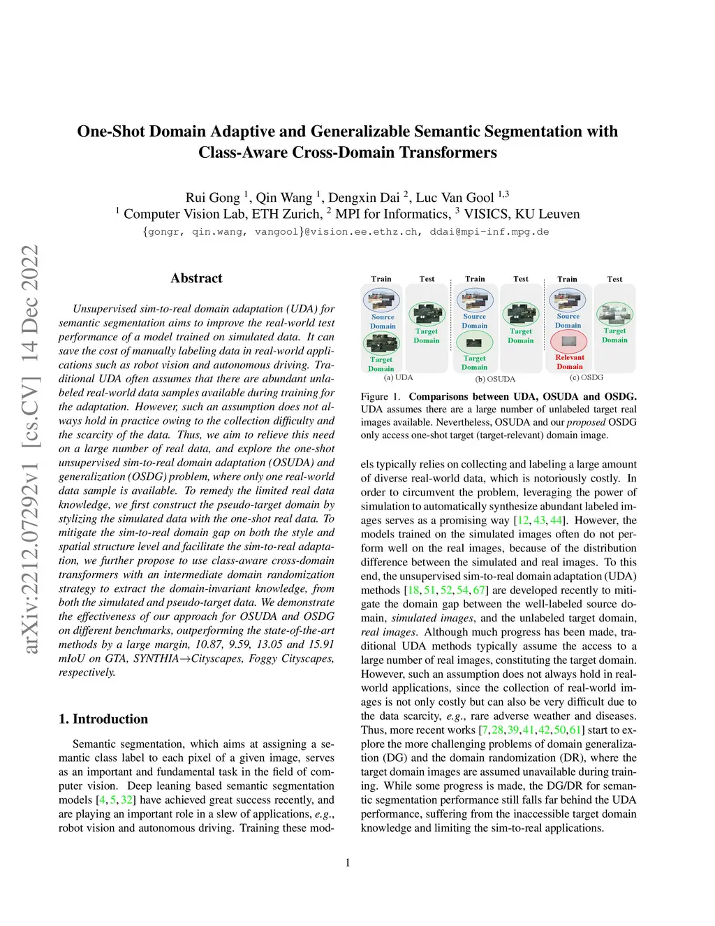 Unsupervised sim-to-real domain adaptation (UDA) for semantic segmentation aims to improve the real-world test performance of a model trained on simulated data. It can save the cost of manually labeling data in real-world applications such as robot vision and autonomous driving. Traditional UDA often assumes that there are abundant unlabeled real-world data samples available during training for the adaptation. However, such an assumption does not always hold in practice owing to the collection difficulty and the scarcity of the data. Thus, we aim to relieve this need on a large number of real data, and explore the one-shot unsupervised sim-to-real domain adaptation (OSUDA) and generalization (OSDG) problem, where only one real-world data sample is available. To remedy the limited real data knowledge, we first construct the pseudo-target domain by stylizing the simulated data with the one-shot real data. To mitigate the sim-to-real domain gap on both the style and spatial structure level and facilitate the sim-to-real adaptation, we further propose to use class-aware cross-domain transformers with an intermediate domain randomization strategy to extract the domain-invariant knowledge, from both the simulated and pseudo-target data. We demonstrate the effectiveness of our approach for OSUDA and OSDG on different benchmarks, outperforming the state-of-the-art methods by a large margin, 10.87, 9.59, 13.05 and 15.91 mIoU on GTA, SYNTHIACityscapes, Foggy Cityscapes, respectively.