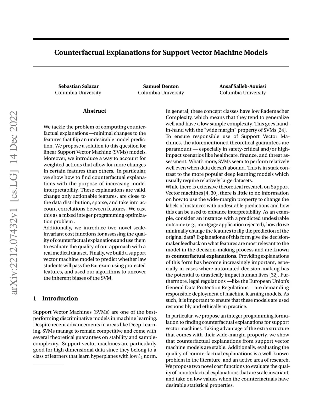 We tackle the problem of computing counterfactual explanations -- minimal changes to the features that flip an undesirable model prediction. We propose a solution to this question for linear Support Vector Machine (SVMs) models. Moreover, we introduce a way to account for weighted actions that allow for more changes in certain features than others. In particular, we show how to find counterfactual explanations with the purpose of increasing model interpretability. These explanations are valid, change only actionable features, are close to the data distribution, sparse, and take into account correlations between features. We cast this as a mixed integer programming optimization problem. Additionally, we introduce two novel scale-invariant cost functions for assessing the quality of counterfactual explanations and use them to evaluate the quality of our approach with a real medical dataset. Finally, we build a support vector machine model to predict whether law students will pass the Bar exam using protected features, and used our algorithms to uncover the inherent biases of the SVM.